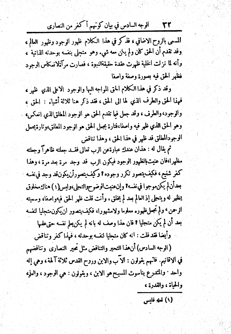الوجه السادس: أن هذا التحير والتناقض مثل تحير النصارى وتناقضهم في الأقانيم. فإنهم يقولون: الأب والابن وروح القدس ثلاثة آلهة، وهي إله واحد. والمتدرع بناسوت المسيح هو الابن، ويقولون: هي الوجود، والعلم، والحياة، والقدرة.