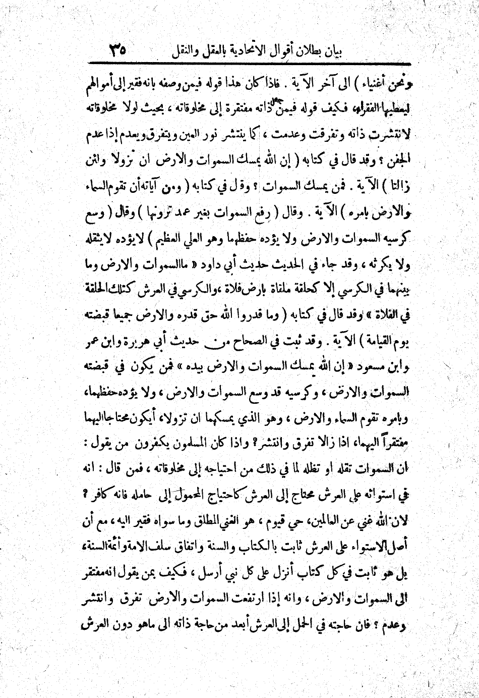 ونحن أغنياء) إلى آخر الآية. فإذا كان هذا قوله فيمن وصفه بأنه فقير إلى أموالهم ليعطيها الفقراء، فكيف قوله فيمن جعل ذاته مفتقرة إلى مخلوقاته، بحيث لولا مخلوقاته لانتشرت ذاته وتفرقت وعدمت، كما ينتشر نور العين ويتفرق ويعدم إذا عدم الجفن؟ وقد قال في كتابه (إن الله يمسك السموات والأرض أن تزولا ولئن زالتا) الآية. فمن يمسك السموات؟ وقال في كتابه (ومن آياته أن تقوم السماء والأرض بأمره) الآية. وقال (رفع السموات بغير عمد ترونها) وقال (وسع كرسيه السموات والأرض ولا يؤده حفظهما وهو العلي العظيم) لا يؤده لا يثقله ولا يكرثه، وقد جاء في الحديث حديث أبي داود " ما السموات والأرض وما بينهما في الكرسي إلا كحلقة ملقاة بأرض فلاة، والكرسي في العرش كتلك الحلقة في الفلاة " وقد قال في كتابه " وما قدروا الله حق قدره والأرض جميعاً قبضته يوم القيامة) الآية. وقد ثبت في الصحاح من حديث أبي هريرة وابن عمر وابن مسعود " إن الله يمسك السموات والأرض بيده " فمن يكون في قبضته السموات والأرض، وكرسيه قد وسع السموات والأرض، ولا يؤده حفظهما، وبأمره تقوم السماء والأرض، وهو الذي يمسكها أن تزولا، أيكون محتاجاً إليهما مفتقراً إليهما، إذا زالا تفرق وانتشر؟ وإذا كان المسلمون يكفرون من يقول: إن السموات تقله أو تظله لما في ذلك من احتياجات إلى مخلوقاته، فمن قال: إنه في استوائه على العرش محتاج إلى العرش كاحتياج المحمول إلى حامله فإنه كافر؟ لأن الله غني عن العالمين، حي قيوم، هو الغني المطلق وما سواه فقير إليه، مع أن أصل الاستواء على العرش ثابت بالكتاب والسنة واتفاق سلف الأمة وأئمة السنة، بل هو ثابت في كل كتاب أنزل على كل نبي أرسل، فكيف بمن يقول أنه مفتقر إلى السموات والأرض، وأنه إذا ارتفعت السموات والأرض تفرق وانتشر وعدم؟ فإن حاجته في الحمل إلى العرش أبعد من حاجة ذاته إلى ما هو دون العرش.