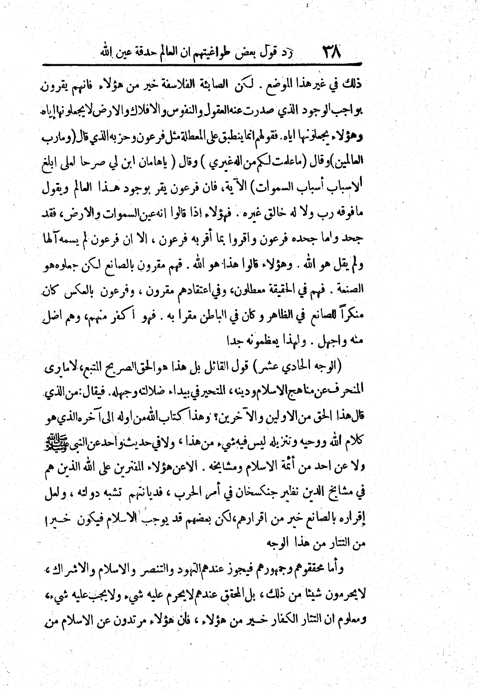 الوجه الحادي عشر: قول القائل بل هذا هو الحق الصريح المتبع، لا ما يرى المنحرف عن مناهج الإسلام ودينه، المتحير في بيداء ضلالته وجهله. فيقال: من الذي قال هذا الحق من الأولين والآخرين؟ وهذا كتاب الله من أوله إلى آخره الذي هو كلام الله ووحيه وتنزيله ليس فيه شيء من هذا، ولا في حديث واحد عن النبي صلى الله عليه وسلم ولا عن أحد من أئمة الإسلام ومشايخه، إلا عن هؤلاء المفترين على الله الذين هم في مشايخ الدين نظير جنكسخان في أمر الحرب، فديانتهم تشبه دولته، ولعل إقراره بالصانع خير من إقرارهم، لكن بعضهم قد يوجب الإسلام فيكون خيراً من التتار في هذا الوجه.