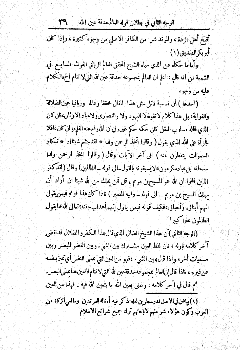 أحدها أن تسمية قائل مثل هذا المقال محققاً وعالماً وربانياً عين الضلالة والغواية، بل هذا كلام لا تقوله لا اليهود ولا النصارى ولا عباد الأوثان، فإن كان الذي قاله مسلوب العقل كان حكمه حكم غيره في أن الله رفع عنه القلم، وإن كان عاقلاً فجرأة على الله الذي يقول (وقالوا اتخذ الرحمن ولدا، لقد جئتم شيئاً أدا، تكاد السموات يتفطرن منه) إلى آخر الآيات وقال (وقالوا اتخذ الرحمن ولدا سبحانه بل عباد مكرمون، لا يسبقونه بالقول) إلى قوله (الظالمين) وقال (لقد كفر الذين قالوا أن الله هو المسيح بن مريم، قل فمن يملك من الله شيئاً إن أراد أن يهلك المسيح بن مريم) إلى قوله (وإليه المصير) فإذا كان هذا قوله فيمن يقول إنهم أبناؤه وأحباؤه، فكيف قوله فيمن يقول إنهم أهداب جفنه؟ تعالى الله عما يقول الظالمون علواً كبيراً.