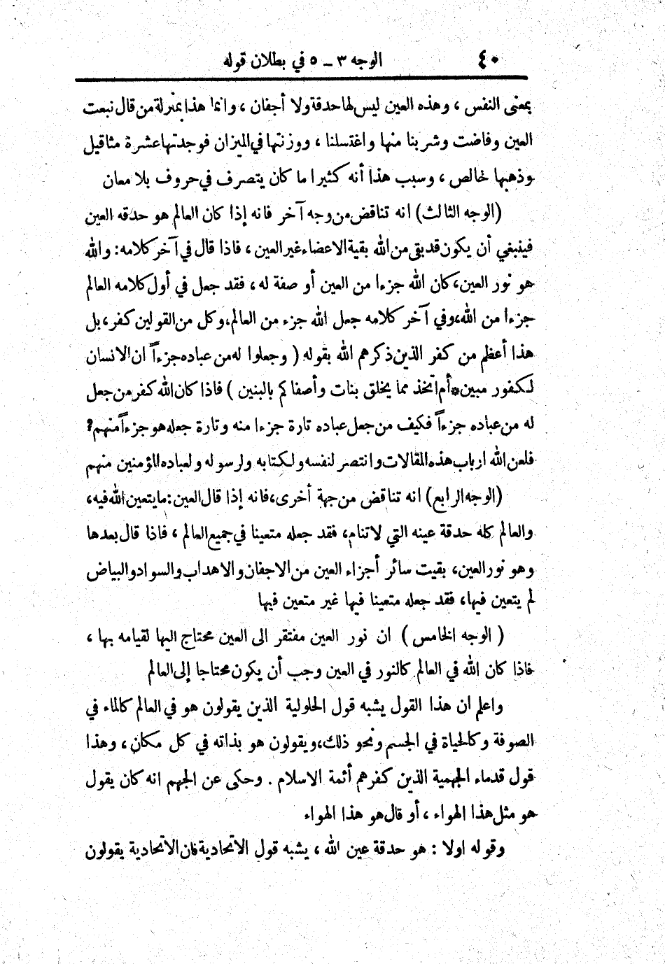 الوجه الرابع: إنه تناقض من جهة أخرى، فإنه إذا قال العين: ما يتعين الله فيه، والعالم كله حدقة عينه التي لا تنام، فقد جعله متعيناً في جميع العالم، فإذا قال بعدها وهو نور العين، بقيت سائر أجزاء العين من الأجفان والأهداب والسواد والبياض لم يتعين فيها، فقد جعله متعيناً فيها غير متعين فيها.