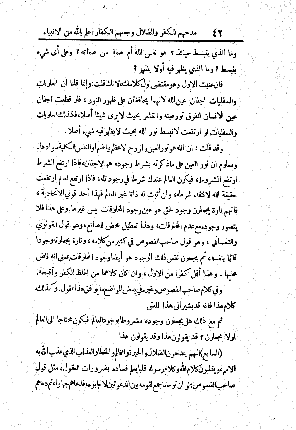 وما الذي ينبسط حينئذ؟ هو نفس الله أم صفة من صفاته؟ وعلى أي شيء ينبسط؟ وما الذي يظهر فيه أو لا يظهر؟ فإن عنيت الأول وهو مقتضى أول كلامك، لأنك قلت: وإنما قلنا أن العلويات والسفليات أجفان عين الله لأنهما يحافظان على ظهور النور، فلو قطعت أجفان عين الإنسان لتفرق نور عينه وانتشر بحيث لا يرى شيئاً أصلاً، فكذلك العلويات والسلفليات لو ارتفعت لانبسط نور الله بحيث لا يظهر فيه شيء أصلاً.