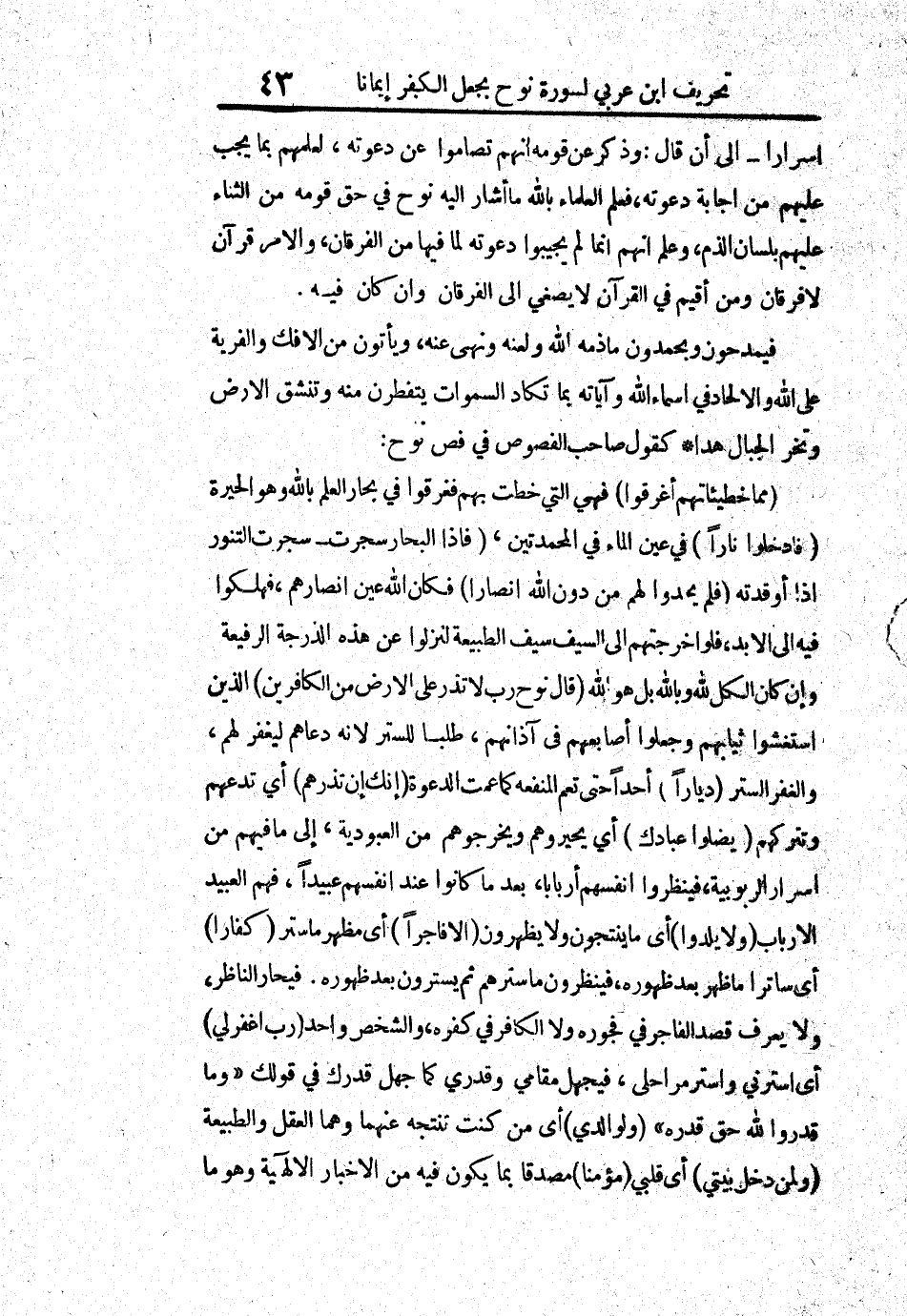 فيمدحون ويحمدون ما ذمه الله ولعنه ونهى عنه، ويأتون من الأفك والفرية على الله الإلحاد في أسماء الله وآياته بما تكاد السموات يتفطرن منه وتنشق الأرض وتخر الجبال هدا، كقول صاحب الفصوص في فص نوح: " مما خطيئاتهم أغرقوا " فهي التي خطت بهم فغرقوا في بحار العالم بالله وهو الحيرة (فادخلوا ناراً) في عين الماء في المحمدتين، (فإذا البحار سجرت - سجرت التنور إذا أوقدته (فلم يجدوا لهم من دون الله أنصاراً) فكان الله عين أنصارهم، فهلكوا فيه إلى الأبد، فلو أخرجتهم إلى السيف سيف الطبيعة لنزلوا عن هذه الدرجة الرفيعة وإن كان الكل لله وبالله بل هو الله (قال نوح رب لا تذر على الأرض من الكافرين) الذين استغشوا ثيابهم وجعلوا أصابعهم في آذانهم، طلباً للستر لأنه دعاهم ليغفر لهم، والغفر الستر (دياراً) أحداً حتى تعم المنفعة كما عمت الدعوة (إنك إن تذرهم) أي تدعهم وتتركهم (يضلوا عبادك) أي يحيروهم ويخرجوهم من العبودية، إلى ما فيهم من أسرار الربوبية، فينظروا أنفسهم أرباباً، بعدما كانوا عند أنفسهم عبيداً، فهم العبيد الأرباب (ولا يلدوا) أي ما ينتجون ولا يظهرون (إلا فاجراً) أي مظهر ما ستر (كفاراً) أي ساتراً ما ظهر بعد ظهوره، فينظرون ما سترهم ثم يسترون بعد ظهوره. فيحار الناظر، ولا يعرف قصد الفاجر في فجوره ولا الكافر في كفره، والشخص وحد (رب اغفر لي) أي استرني واستر مراحلي، فيجعل مقامي وقدري كما جهل قدرك في قولك " وما قدروا لله حق قدره " (ولوالدي) أي من كنت تنتجه عنهما وهما العقل والطبيعة (ولمن دخل بيتي) أي قلبي (مؤمناً) مصدقاً بما يكون فيه من الأخبار الإلهية وهو ما