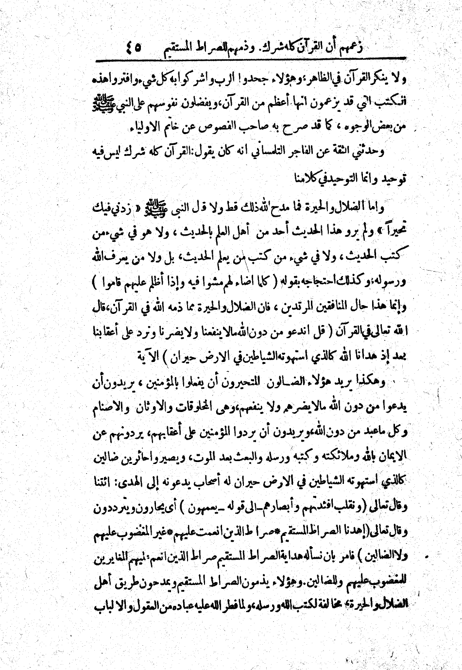 وأما الضلال والحيرة فما مدح لله ذلك قط ولا قول النبي صلى الله عليه وسلم " زدني فيك تحيراً " ولم يرو هذا الحديث أحد من أهل العلم بالحديث، ولا هو في شيء من كتب الحديث، ولا في شيء من كتب من يعلم الحديث، بل ولا من يعرف الله ورسوله، وكذلك احتجاجه بقوله (كلما أضاء لهم مشوا فيه وإذا أظلم عليهم قاموا) وإنما هذا حال المنافقين المرتدين، فإن الضلال والحيرة مما ذمه الله في القرآن، قال الله تعالى في القرآن (قل أندعو من دون الله ما لا ينفعنا ولا يضرنا ونرد على أعقابنا بعد إذ هدانا الله كالذي استوته الشياطين في الأرض حيران) الآية.