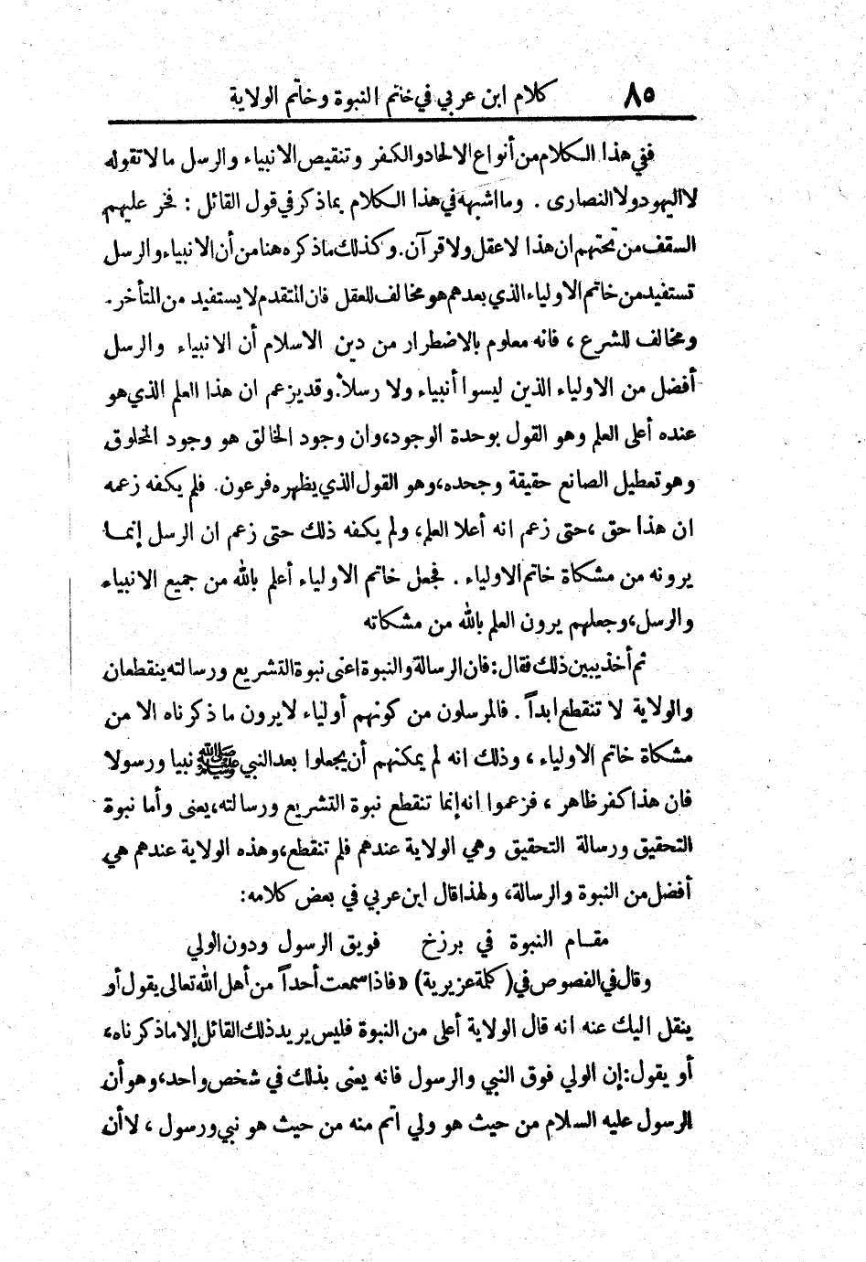 وقال في الفصوص في كلمة عزيرية فإذا سمعت أحداً من أهل الله تعالى يقول أو ينقل إليك عنه أنه قال الولاية أعلى من النبوة فليس يريد ذلك القائل إلا ما ذكرناه، أو يقول: إن الولي فوق النبي والرسول فإنه يعني بذلك في شخص واحد، وهو أن الرسول عليه السلام من حيث هو ولي أتم منه من حيث هو نبي ورسول، لا أن