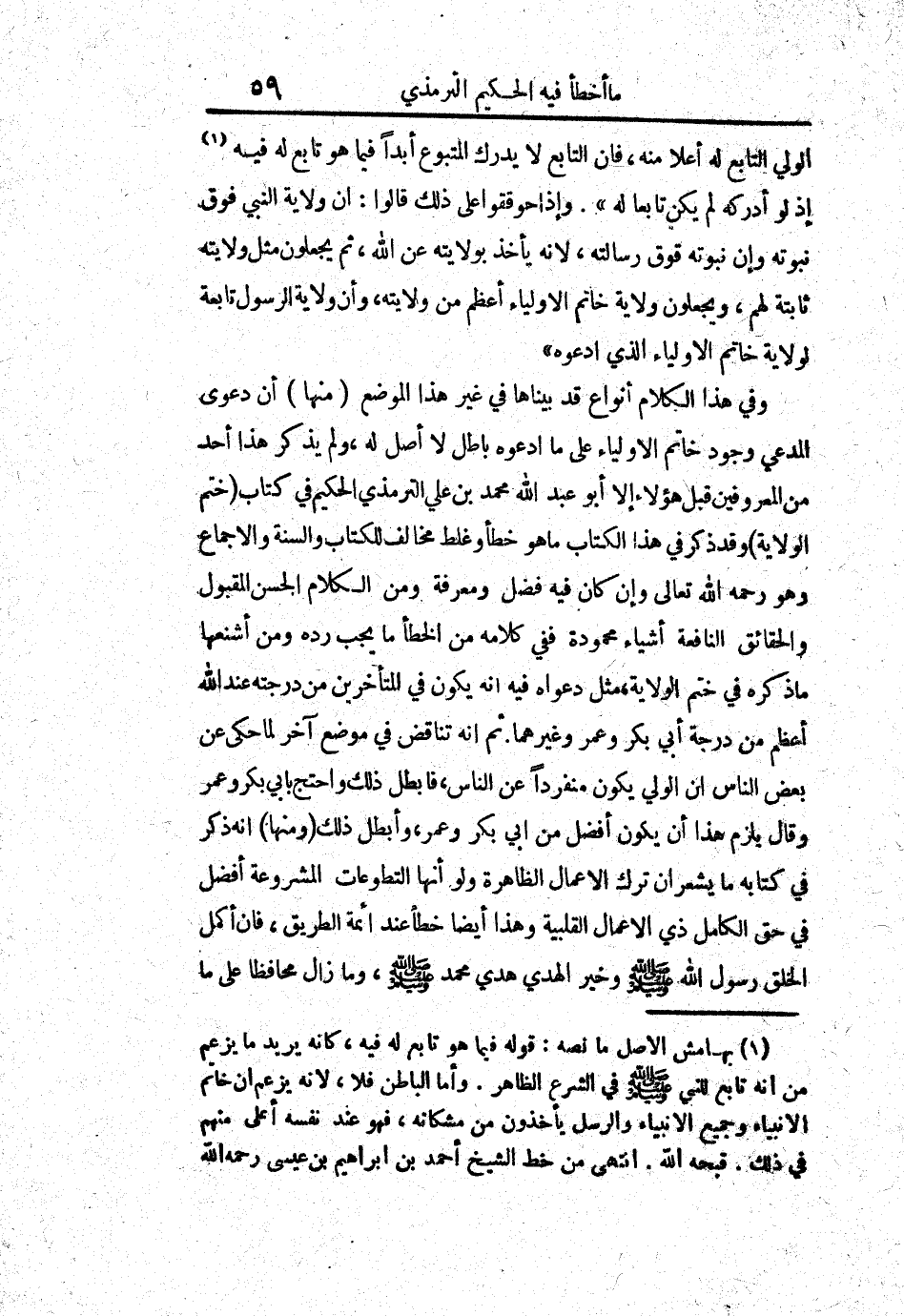 وفي هذا الكلام أنواع قد بيناها في غير هذا الموضع منها أن دعوى المدعي وجود خاتم الأولياء على ما أدعوه باطل لا أصل له، ولم يذكر هذا أحد من المعروفين قبل هؤلاء إلا أبو عبد الله محمد بن علي الترمذي الحكيم في كتاب " ختم الولاية " وقد ذكر في هذا الكتاب ما هو خطأ وغلط مخالف للكتاب والسنة والإجماع وهو رحمه الله تعالى وإن كان فيه فضل ومعرفة ومن الكلام الحسن المقبول والحقائق النافعة أشياء محمودة ففي كلامه من الخطأ ما يجب رده ومن أشنعها ما ذكره في ختم الولاية، مثل دعوه فيه أنه يكون في المتأخرين من درجته عند الله أعظم من درجة أبي بكر وعمر وغيرهما. ثم أنه تناقض في موضع آخر لما حكى عن بعض الناس أن الولي يكون منفرداً عن الناس، فأبطل ذلك واحتج بأبي بكر وعمر وقال يلزم هذا أن يكون أفضل من أبي بكر وعمر، وأبطل ذلك " ومنها " أنه ذكر في كتابه ما يشعر أن ترك الأعمال الظاهرة ولو أنها التطوعات المشروعة أفضل في حق الكامل ذي الأعمال القلبية وهذا أيضاً خطأ عند أئمة الطريق، فإن أكمل الخلق رسول الله صلى الله عليه وسلم وخير الهدي هدي محمد صلى الله عليه وسلم، وما زال محافظاً على ما