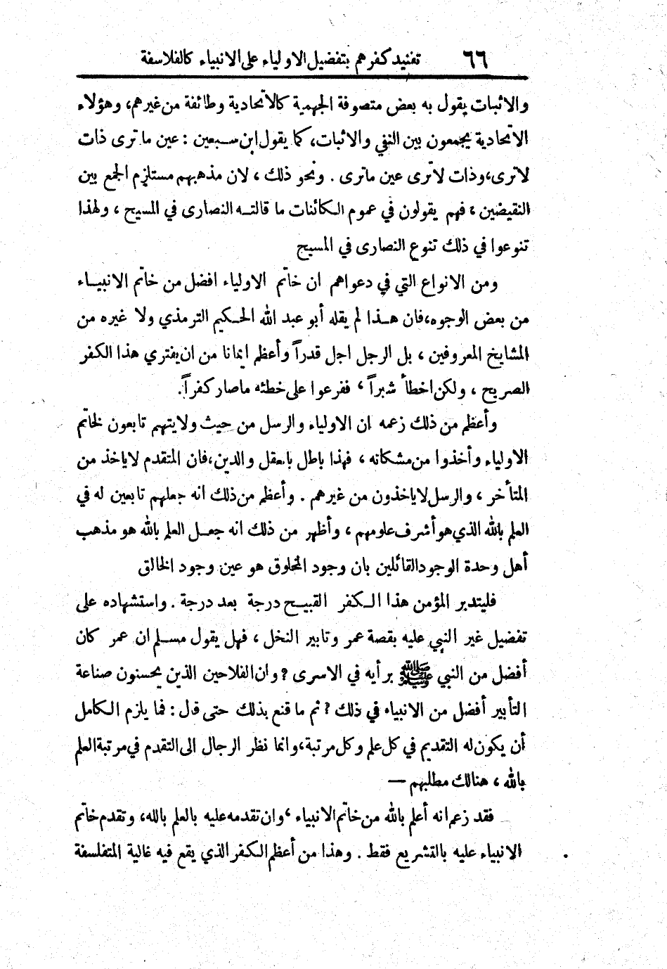 ومن الأنواع التي في دعواهم أن خاتم الأولياء أفضل من خاتم الأنبياء من بعض الوجوه، إن هذا لم يقله أبو عبد الله الحكيم الترمذي ولا غيره من المشايخ المعروفين، بل الرجل أجل قدراً وأعظم إيماناً من أن يفتري هذا الكفر الصريح، ولكن أخطأ شبراً، ففرعوا على خطئه ما صار كفراً.