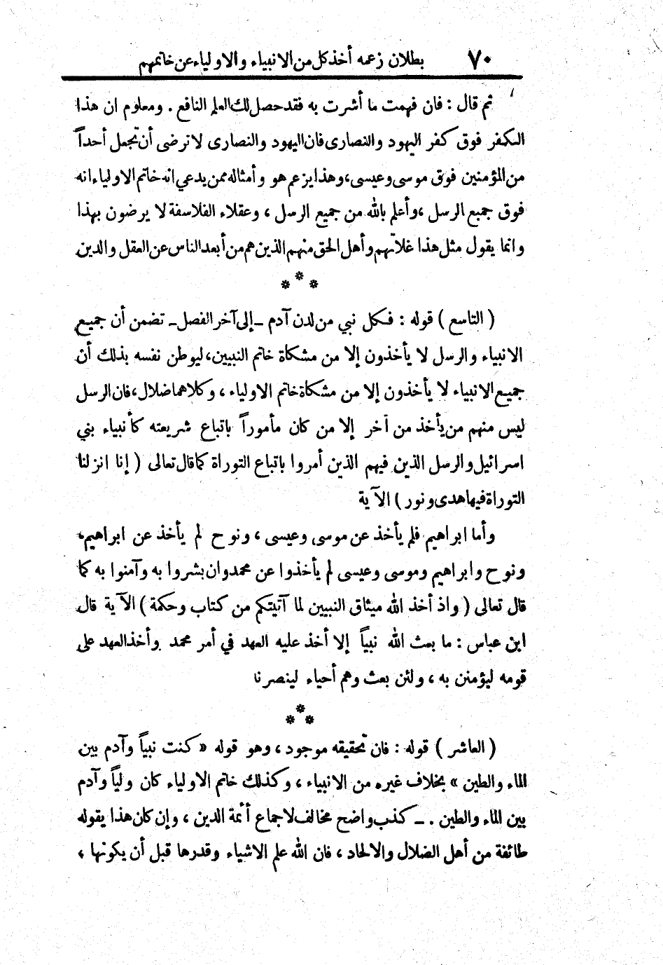 التاسع قوله: فكل نبي من لدن آدم - إلى آخر الفصل - تضمن أن جميع الأنبياء والرسل لا يأخذون إلا من مشكاة خاتم النبيين، ليوطن نفسه بذلك أن جميع الأنبياء لا يأخذون إلا من مشكاة خاتم الأولياء، وكلاهما ضلال، فإن الرسل ليس منهم من يأخذ من آخر إلا من كان مأموراً باتباع شريعته كأنبياء بني إسرائيل والرسل الذين فيهم الذين أمروا باتباع التوراة كما قال تعالى (إنا أنزلنا التوراة فيها هدى ونور) الآية.