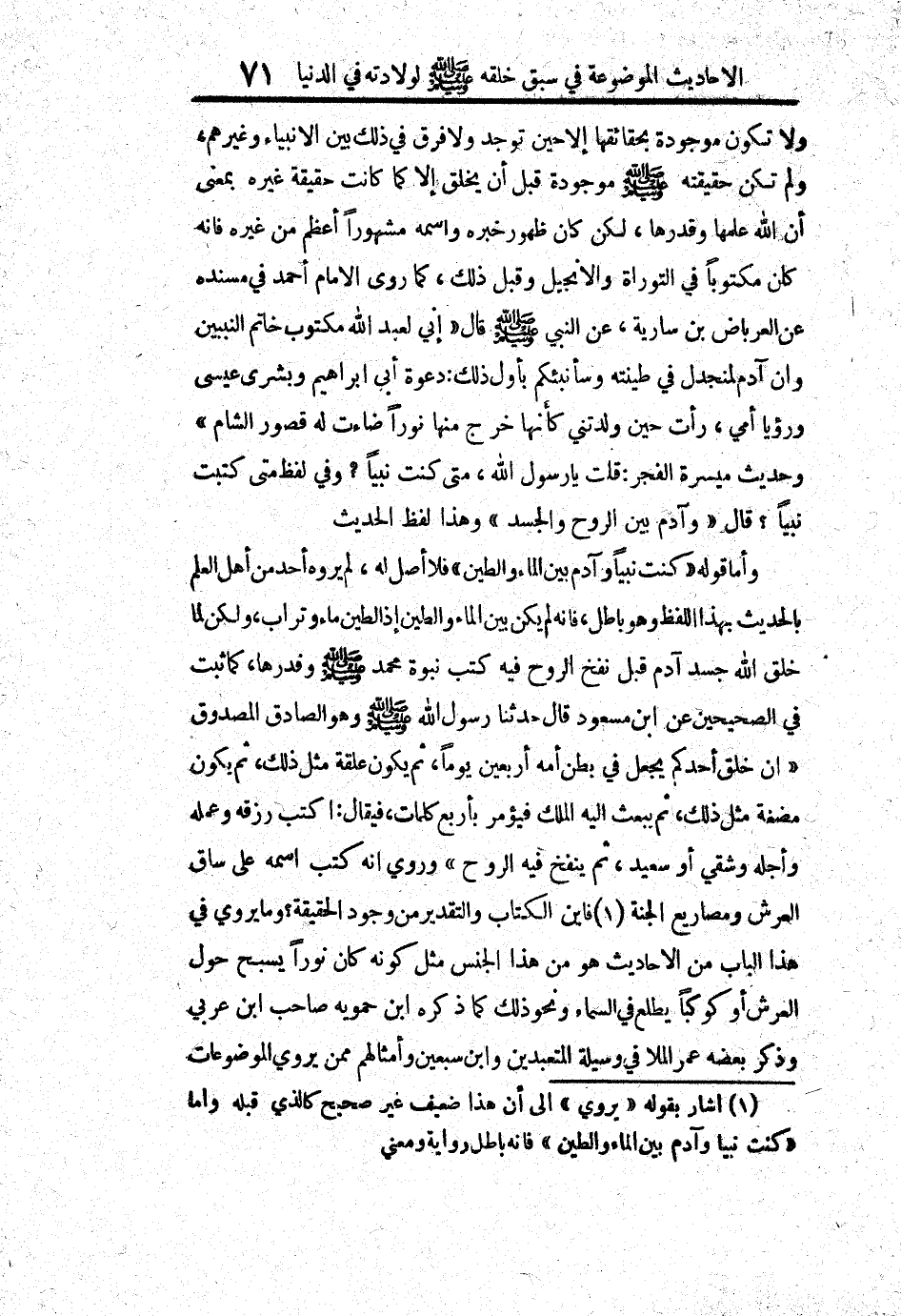 وأما قوله " كنت نبياً وآدم بين الماء والطين " فلا أصل له، لم يروه أحد من أهل العلم بالحديث بهذا اللفظ وهو باطل، فإنه لم يكن بين الماء والطين إذ الطين ماء وتراب، ولكن لما خلق الله جسد آدم قبل نفخ الروح فيه كتب نبوة محمد صلى الله عليه وسلم وقدرها، كما ثبت في الصحيحين عن ابن مسعود قال حدثنا رسول الله صلى الله عليه وسلم وهو الصادق المصدوق " إن خلق أحدكم يجعل في بطن أمه أربعين يوماً، ثم يكون علقة مثل ذلك، ثم يكون مضغة مثل ذلك، ثم يبعث إليه الملك فيؤمر بأربع كلمات، فيقال: اكتب رزقه وعمله وأجله وشقي أو سعيد، ثم ينفخ فيه الروح " وروي أنه كتب اسمه على ساق العرش ومصاريع الجنة (1) فأين الكتاب والتقدير من وجود الحقيقة؟ وما يروي في هذا الباب من الأحاديث هو من هذا الجنس مثل كونه كان نوراً يسبح حول العرش أو كوكباً يطلع في السماء ونحو ذلك كما ذكره ابن حمويه صاحب ابن عربي وذكر بعضه عمر الملا في وسيلة المتعبدين وابن سبعين وأمثالهم ممن يروي الموضوعات