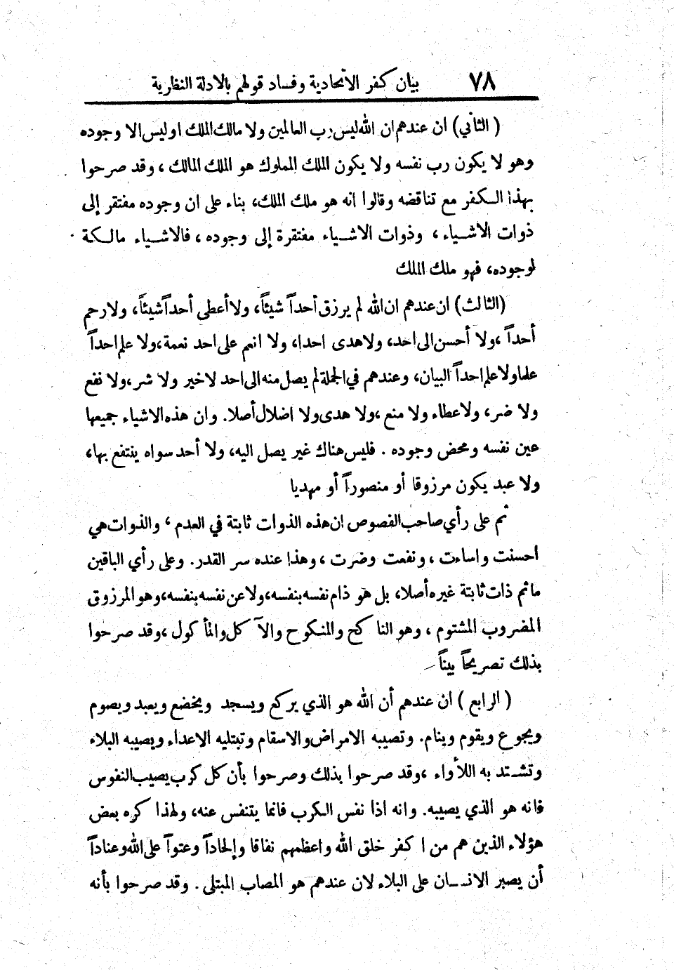 الثاني أن عندهم أن الله ليس رب العالمين ولا مالك الملك أو ليس إلا وجوده وهو لا يكون رب نفسه ولا يكون الملك المملوك هو الملك المالك، وقد صرحوا بهذا الكفر مع تناقضه وقالوا أنه هو ملك الملك، بناء على أن وجوده مفتقر إلى ذوات الأشياء، وذوات الأشياء مفتقرة إلى وجوده، فالأشياء مالكة لوجوده، فهو ملك الملك.