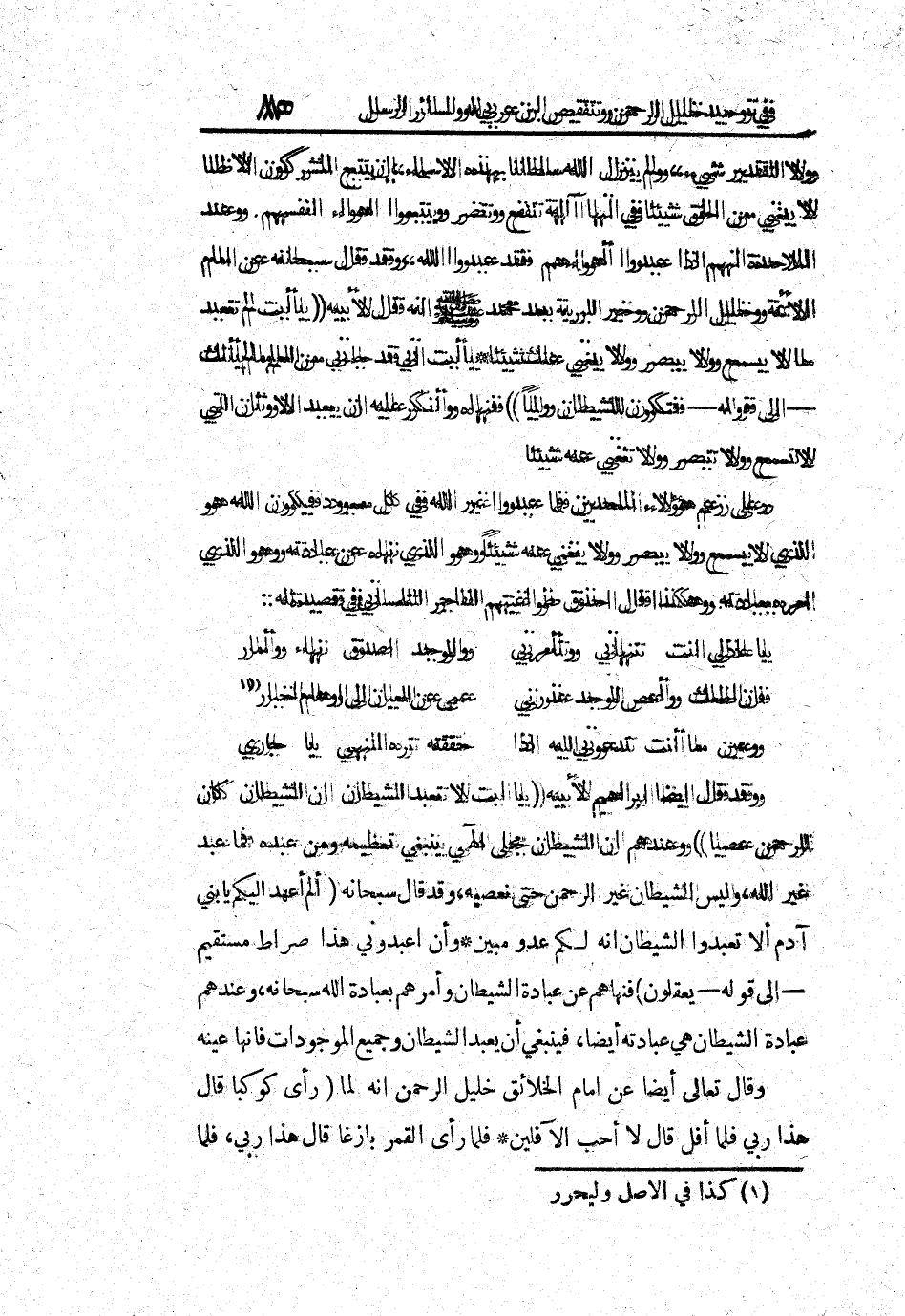 وقد قال أيضاً إبراهيم لأبيه (يا أبت لا تعبد الشيطان إن الشيطان كان للرحمن عصيا) وعندهم أن الشيطان مجلى إلهي ينبغي تعظيمه ومن عبده فما عبد غير الله، وليس الشيطان غير الرحمن حتى تعصيه، وقد قال سبحانه (ألم أعهد إليكم يا بني آدم ألا تعبدوا الشيطان إنه لكم عدو مبين، وأن اعبدوني هذا صراط مستقيم) إلى قوله (يعقلون) فنهاهم عن عبادة الشيطان وأمرهم بعبادة الله سبحانه، وعندهم عبادة الشيطان هي عبادته أيضاً، فينبغي أن يعبد الشيطان وجميع الموجودات إنها عينه.