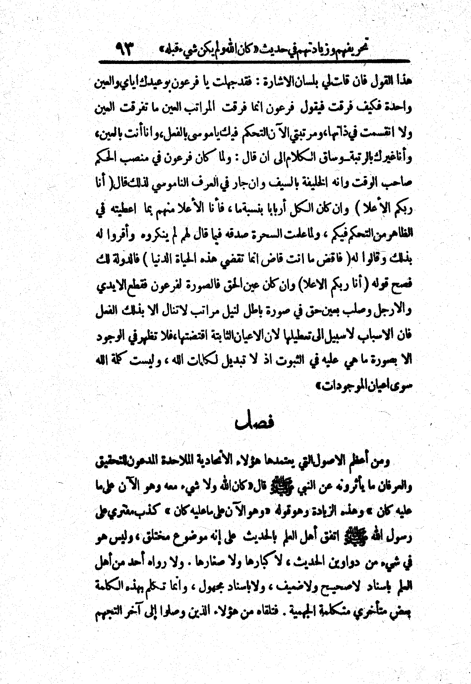 ومن أعظم الأصول التي يعتمدها هؤلاء الاتحادية الملاحدة المدعون للتحقيق والعفان ما يأثرونه عن النبي صلى الله عليه وسلم قال " كان الله ولا شيء معه وهو الآن على ما عليه كان " وهذه الزيادة وهو قوله " وهو الآن على ما عليه كان " كذب مفتري على رسول الله صلى الله عليه وسلم اتفق أهل العلم بالحديث على أنه موضوع مختلق، وليس هو في شيء من دواوين الحديث، لا كبارها ولا صغارها. ولا رواه أحد من أهل العلم بإسناد لا صحيح ولا ضعيف، ولا بإسناد مجهول، وإنما تكلم بهذه الكلمة بعض متأخري متكلمة الجهمية. فتلقاه هؤلاء الذين وصلوا إلى آخر التجهم