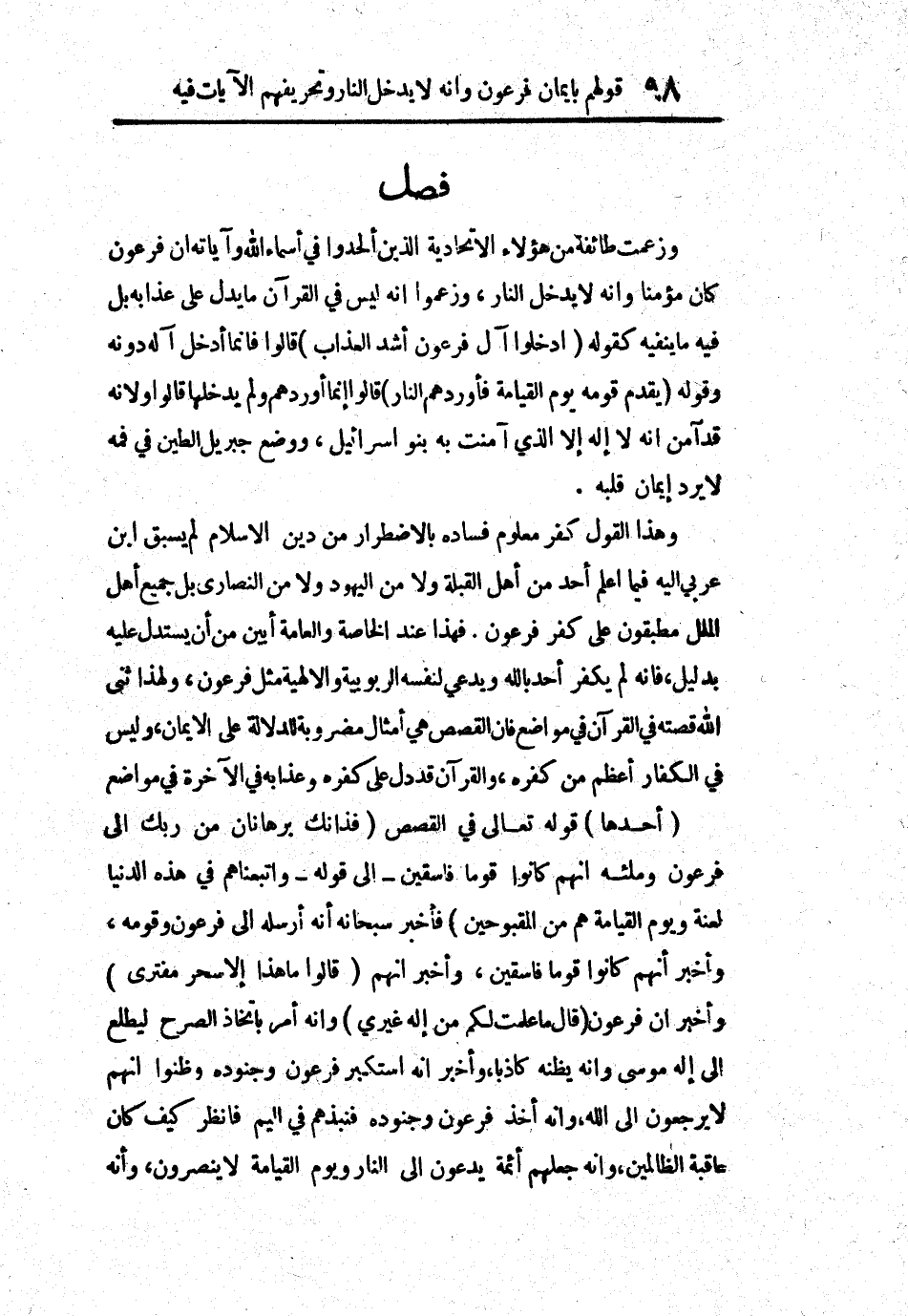 وهذا القول كفر معلوم فساده بالاضطرار من دين الإسلام لم يسبق ابن عربي إليه فيما أعلم أحد من أهل القبلة ولا من اليهود ولا من النصارى بل جميع أهل الملل مطبقون على كفر فرعون. فهذا عند الخاصة والعامة أبين من أن يستدل عليه بدليل، فإنه لم يكفر أحد بالله ويدعي لنفسه الربوبية والإلهية مثل فرعون، ولهذا ثنى الله قصته في القرآن في مواضع فإن القصص هي أمثال مضروبة للدلالة على الإيمان، وليس في الكفار أعظم من كفره، والقرآن قد دل على كفره وعذابه في الآخرة في مواضع.