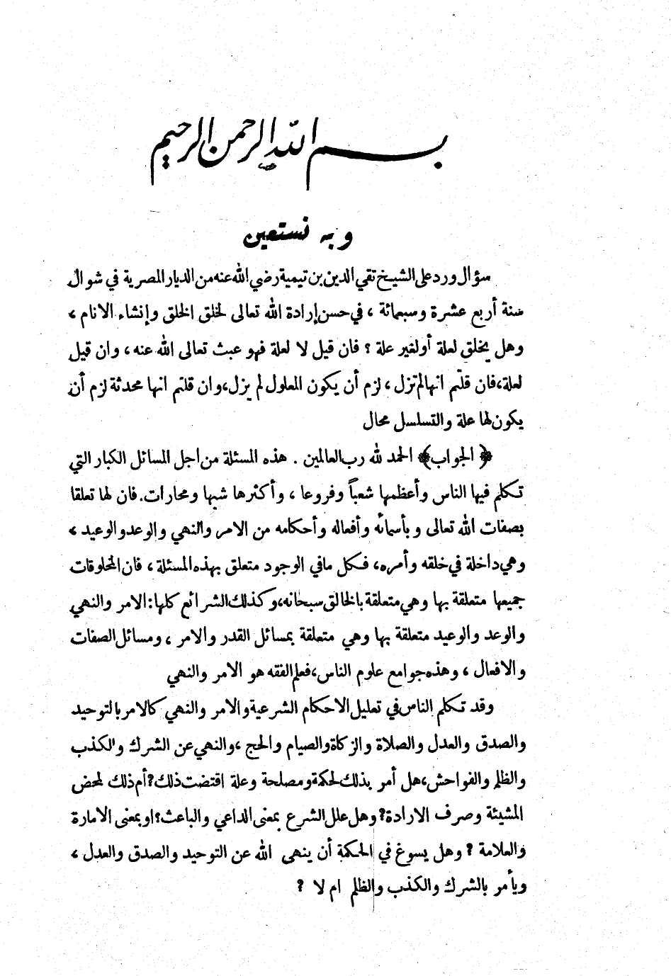 سؤال ورد على الشيخ تقي الدين بن تيمية رضي الله عنه من الديار المصري في شوال سنة أربع عشرة وسبعمائة، في حسن إرادة الله تعالى لخلق الخلق وإنشاء الأنام، وهل يخلق لعلة أو لغير علة؟ فإن قيل لا لعلة فهو عبث تعالى الله عنه، وإن قيل لعلة، فإن قلتم أنها لم تزل، لزم أن يكون المعلول لم يزل، وإن قلتم أنها محدثة لزم أن يكون لها علة والتسلسل محال. (الجواب) الحمد لله رب العالمين. هذه المسئلة من أجل المسائل الكبار التي تكلم فيها الناس وأعظمها شعباً وفروعاً، وأكثرها شبهاً ومحارات. فإن لها تعلقاً بصفات الله تعالى وبأسمائه وأفعاله وأحكامه من الأمر والنهي والوعد والوعيد، وهي داخلة في خلقه وأمره، فكل ما في الوجود متعلق بهذه المسئلة، فإن المخلوقات جميعها متعلقة بها وهي متعلقة بالخالق سبحانه، وكذلك الشرائع كلها: الأمر والنهي والوعد والوعيد متعلقة بها وهي متعلقة بمسائل القدر والأمر، ومسائل الصفات والأفعال، وهذه جوامع علوم الناس، فعلم الفقه هو الأمر والنهي. وقد تكلم الناس في تعليل الأحكام الشرعية والأمر والنهي كالأمر بالتوحيد والصدق والعدل والصلاة والزكاة والصيام والحج، والنهي عن الشرك والكذب والظلم والفواحش، هل أمر بذلك لحكمة ومصلحة وعلة اقتضت ذلك؟ أم ذلك لمحض المشيئة وصرف الإرادة؟ وهل علل الشرع بمعنى الداعي والباعث؟ أو بمعنى الإمارة والعلامة؟ وهل يسوغ في الحكمة أن ينهى الله عن التوحيد والصدق والعدل، ويأمر بالشرك والكذب والظلم أم لا؟.