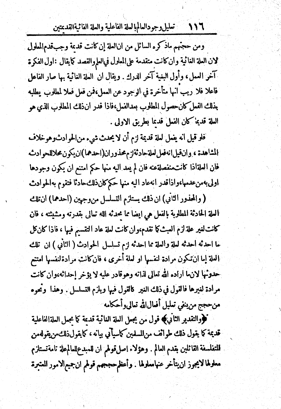 والتقدير الثاني قول من يجعل العلة الغائية قديمة كما يجعل العلة الفاعلية قديمة كما يقول ذلك طوائف من المسلمين كما سيأتي بيانه، كما يقول ذلك من يقوله من المتفلسفة القائلين بقدم العالم. وهؤلاء أصل قولهم أن للمبدع للعالم علة تامة تستلزم معلولها لا يجوز أن يتأخر عنها معلولها. وأعظم حججهم قولهم أن جميع الأمور المعتبرة