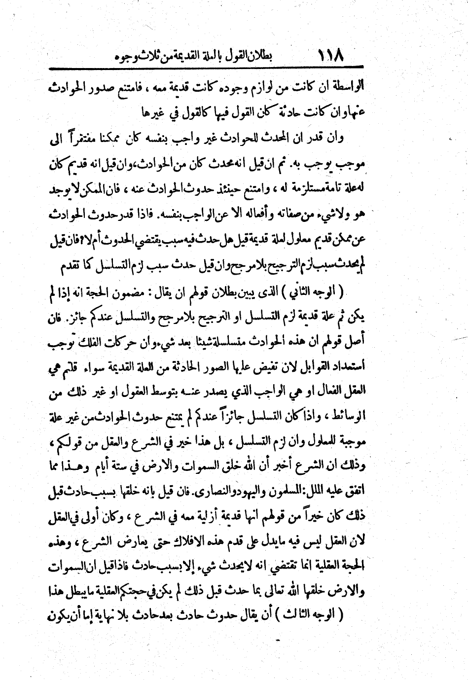 وإن قدر أن المحدث للحوادث غير واجب بنفسه كان ممكناً مفتقراً إلى موجب يوجب به. ثم إن قيل أنه محدث كان من الحوادث، وإن قيل أنه قديم كان له علة تامة مستلزمة له، وامتنع حينئذ حدوث الحوادث عنه، فإن الممكن لا يوجد هو ولا شيء من صفاته وأفعاله إلا عن الواجب بنفسه. فإذا قدر حدوث الحوادث عن ممكن قديم معلول لعلة قديمة قيل هل حدث فيه سبب يقتضي الحدوث أم لا؟ فإن قيل لم يحدث سبب لزم الترجيح بلا مرجح وإن قيل حدث سبب لزم التسلسل كما تقدم.