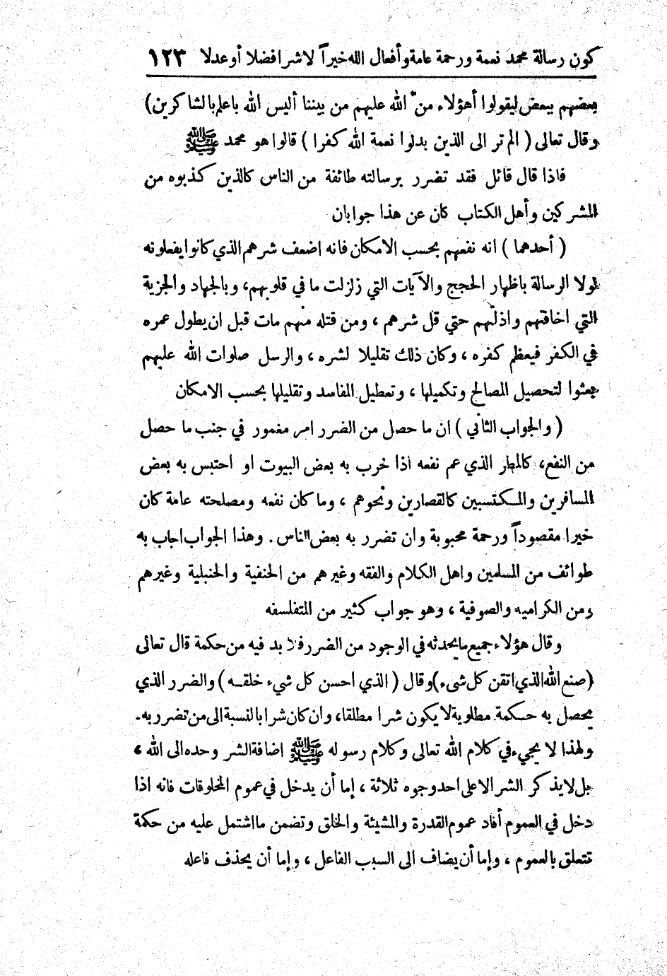 فإذا قال قائل فقد تضرر برسالته طائفة من الناس كالذين كذبوه من المشركين وأهل الكتاب كان عن هذا جوابان.