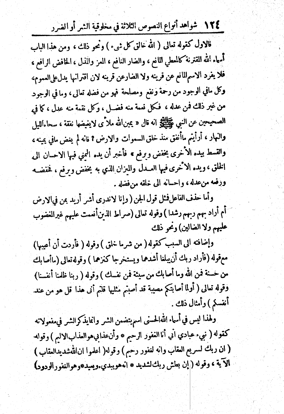 ولهذا ليس في أسماء الله الحسنى اسم يتضمن الشر وإنما يذكر الشر في مفعولاته كقوله (نبيء عبادي إني أنا لغفور رحيم، وأن عذابي هو العذاب الأليم) وقوله (إن ربك لسريع العقاب وإنه لغفور رحيم) وقوله (اعلموا أن الله شديد العقاب) الآية، وقوله (إن بطش ربك لشديد، إنه هو يبدي ويعيد، وهو الغفور الودود)