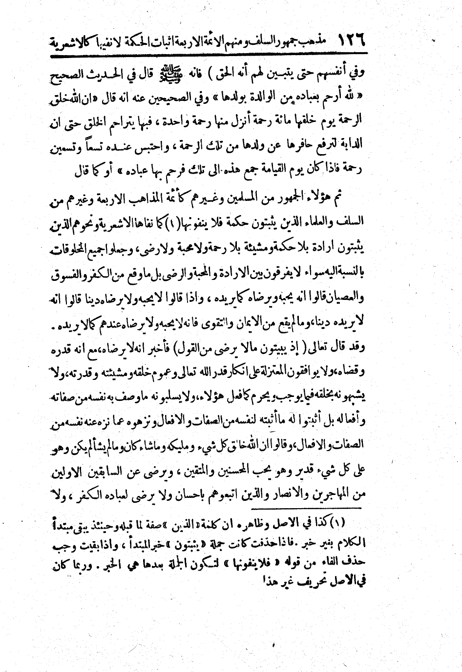 ثم هؤلاء الجمهور من المسلمين وغيرهم كأئمة المذاهب الأربعة وغيرهم من السلف والعلماء الذين يثبتون حكمة فلا ينفونها (1) كما نفاها الأشعرية ونحوهم الذين يثبتون إرادة بلا حكمة ومشيئة بلا رحمة ولا محبة ولا رضى، وجعلوا جميع المخلوقات بالنسبة غليه سواء لا يفرقون بين الإرادة والمحبة والرضى بل ما وقع من الكفر والفسوق والعصيان قالوا إنه يحبه ويرضاه كما يريده، وإذا قالوا لا يحبه ولا يرضاه ديناً قالوا أنه لا يريده ديناً، وما لم يقع من الإيمان والتقوى فإنه لا يحبه ولا يرضاه عندهم كما لا يريده. وقد قال تعالى (إذ يبيتون ما لا يرضى من القول) فأخبر أنه لا يرضاه، مع أنه قدره وقضاه، ولا يوافقون المعتزلة على إنكار قدر الله تعالى وعموم خلقه ومشيئته وقدرته، ولا يشبهونه بخلقه فيما يوجب ويحرم كما فعل هؤلاء، ولا يسلبونه ما وصف به نفسه من صفاته وأفعاله بل أثبتوا له ما أثبته لنفسه من الصفات والأفعال ونزهوه عما نزه عنه نفسه من الصفات والأفعال، وقالوا إن الله خالق كل شيء ومليكه وما شاء كان وما لم يشأ لم يكن وهو على كل شيء قدير وهو يحب المحسنين والمتقين، ويرضى عن السابقين الأولين من المهاجرين والأنصار والذين اتبعوهم بإحسان ولا يرضى لعباده الكفر، ولا