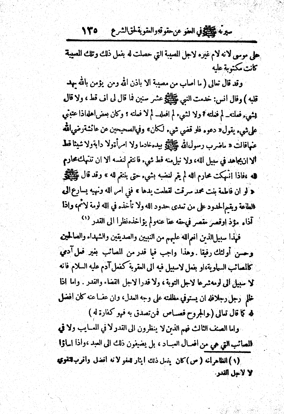 وقد قال تعالى (ما أصاب من مصيبة إلا بإذن الله ومن يؤمن بالله يهد قلبه) وقال أنس: خدمت النبي صلى الله عليه وسلم عشر سنين فما قال لي أف قط، ولا قال لشيء فعلته - لم فعلته؟ ولا لشيء لم أفعله - لم لا فعلته؟ وكان بعض أهله إذا عتبني على شيء يقول " دعوه فلو قضي شيء لكان " وفي الصحيحين عن عائشة رضي الله عنها قالت " ما ضرب رسول الله صلى الله عليه وسلم بيده خادماً ولا امرأة ولا دابة ولا شيئاً قط إلا أن يجاهد في سبيل الله، ولا نيل منه قط شيء فانتقم لنفسه إلا أن تنتهك محارم لله، فإذا انتهكت محارم الله لم يقم لغضبه بشيء حتى ينتقم لله " وقد قال صلى الله عليه وسلم " لو أن فاطمة بنت محمد سرقت لقطعت يدها " ففي أمر الله ونهيه يساره إلى الطاعة ويقيم حدود على من تعدى حدود الله ولا تأخذه في الله لومة لائم، وإذا آذاه مؤذ أو قصر مقصر في حقه عفا عنه ولم يؤاخذه نظراً إلى القدر (1) .