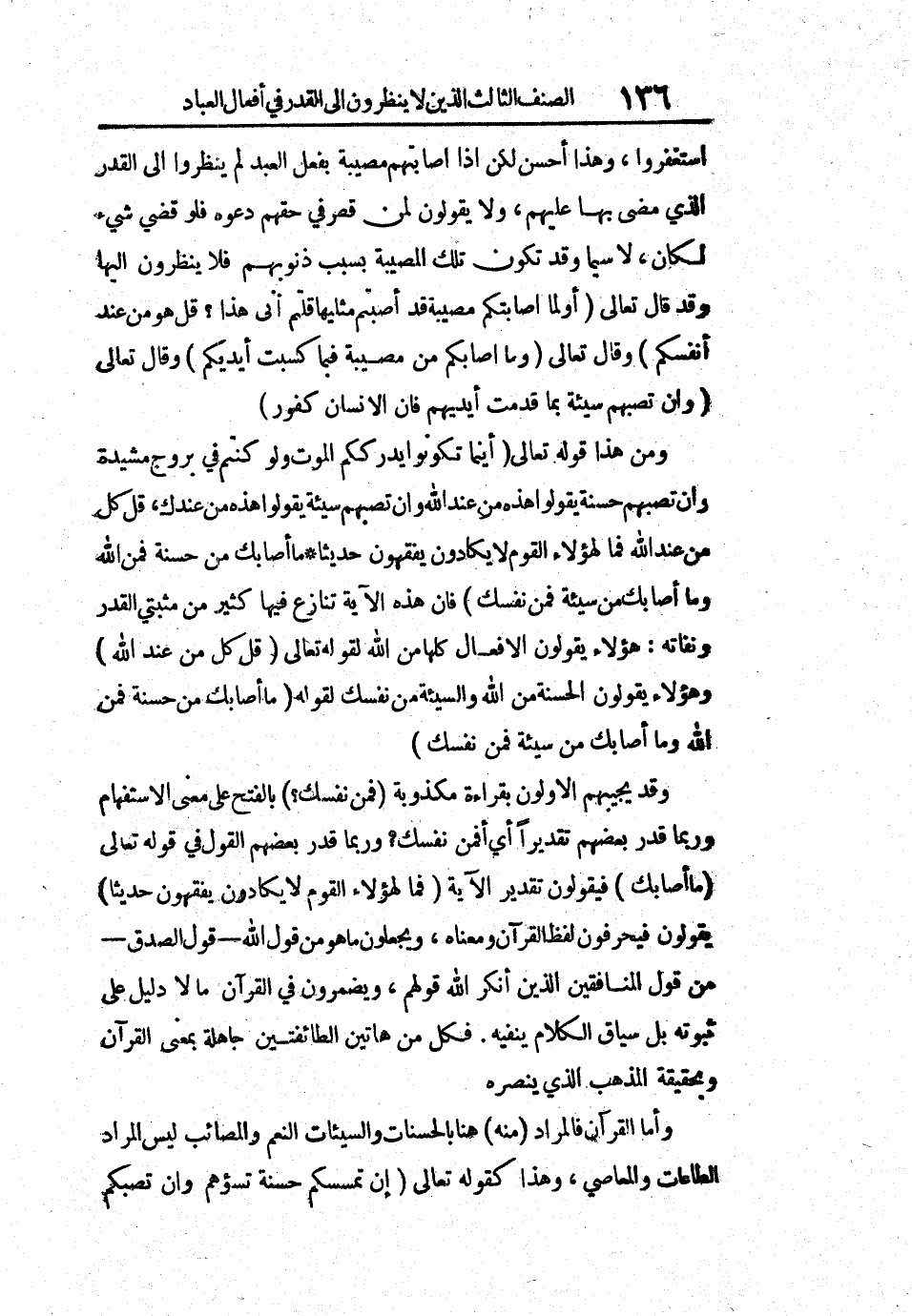 وقد يجيبهم الأولون بقراءة مكذوبة (فمن نفسك؟) بالفتح على معنى الاستفهام وربما قدر بعضهم تقديراً أي أفمن نفسك؟ وربما قدر بعضهم القول في قوله تعالى (ما أصابك) فيقولون تقدير الآية (فما لهؤلاء القوم لا يكادون يفقهون حديثاً) يقولون فيحرفون لفظ القرآن ومعناه، ويجعلون ما هو من قول الله - قول الصدق - من قول المنافقين الذين أنكر الله قولهم، ويضمرون في القرآن ما لا دليل على ثبوته بل سياق الكلام ينفيه. فكل من هاتين الطائفتين جاهلة بمعنى القرآن وبحقيقة المذهب ينصره.
