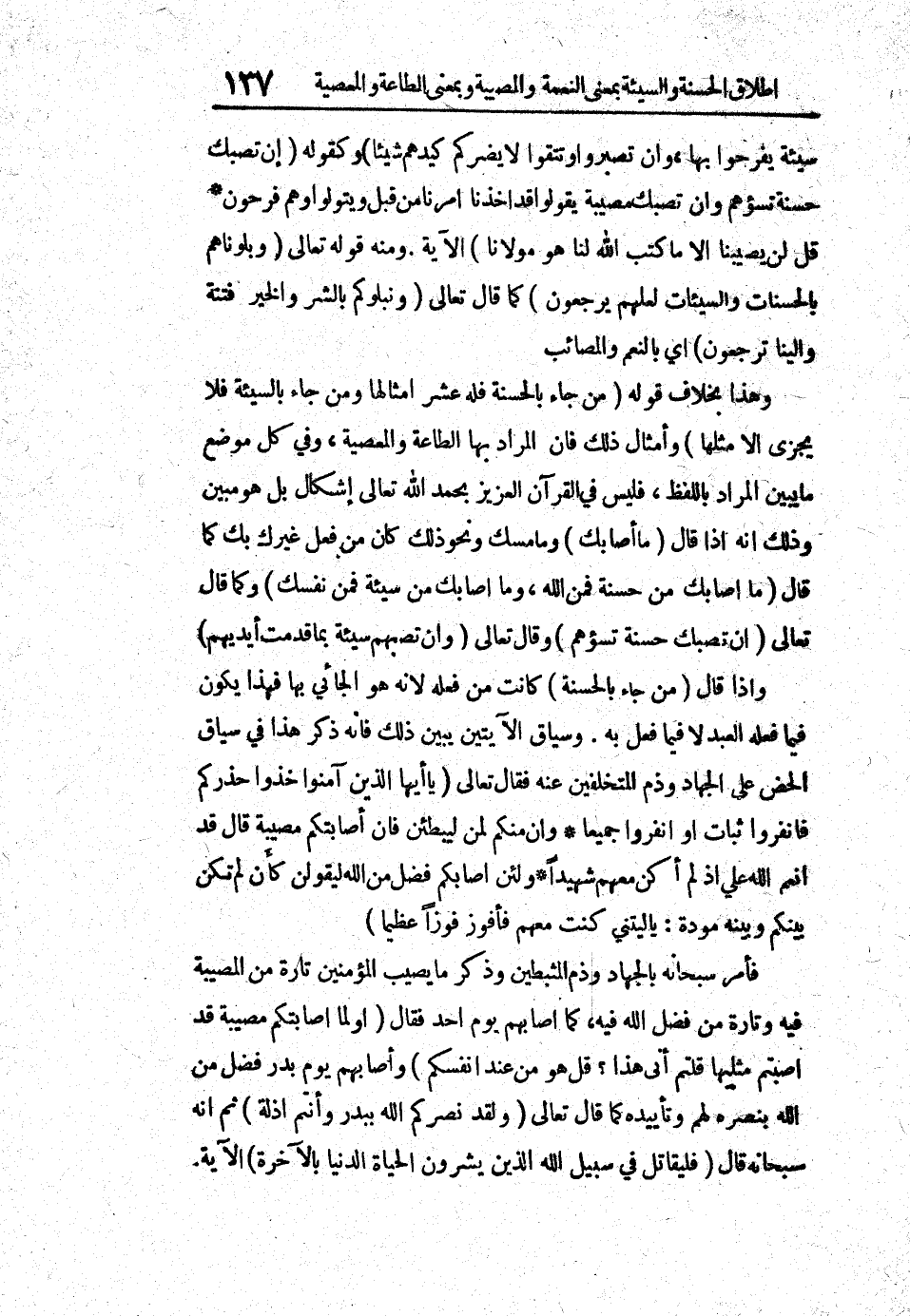 سيئة يفرحوا بها، وإن تصبروا وتتقوا لا يضركم كيدهم شيئاً) وكقوله (إن تصبك حسنة تسؤهم وإن تصبك مصيبة يقولوا قد أخذنا أمرنا من قبل ويتولوا وهم فرحون، قل لن يصيبنا إلا ما كتب الله لنا هو مولانا) الآية. ومنه قوله تعالى (وبلوناهم بالحسنات والسيئات لعلهم يرجعون) كما قال تعالى (ونبلوكم بالشر والخير فتنة وإلينا ترجعون) أي بالنعم والمصائب.