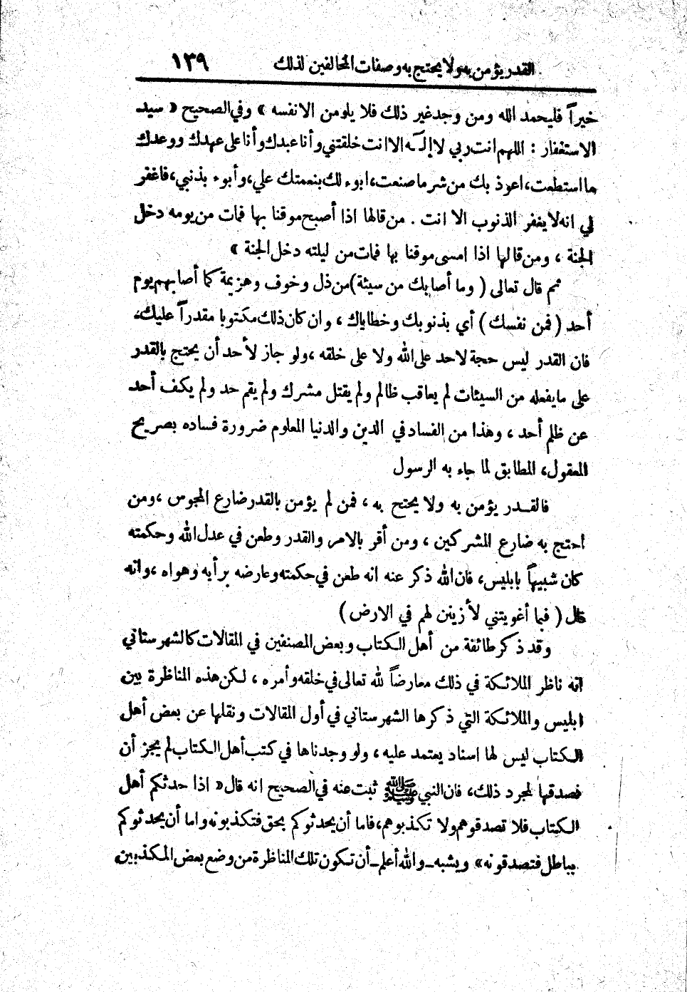 فالقدر يؤمن به ولا يحتج به، فمن لم يؤمن بالقدر ضاع المجوس، ومن احتج به ضارع المشركين، ومن أقر بالأمر والقدر وطعن في عدل الله وحكمته كان شبيهاً بإبليس، فإن الله ذكر عنه أنه طعن في حكمته وعارضه برأيه وهواه، وأنه قال (فيما أغويتني لأزينن لهم في الأرض) .