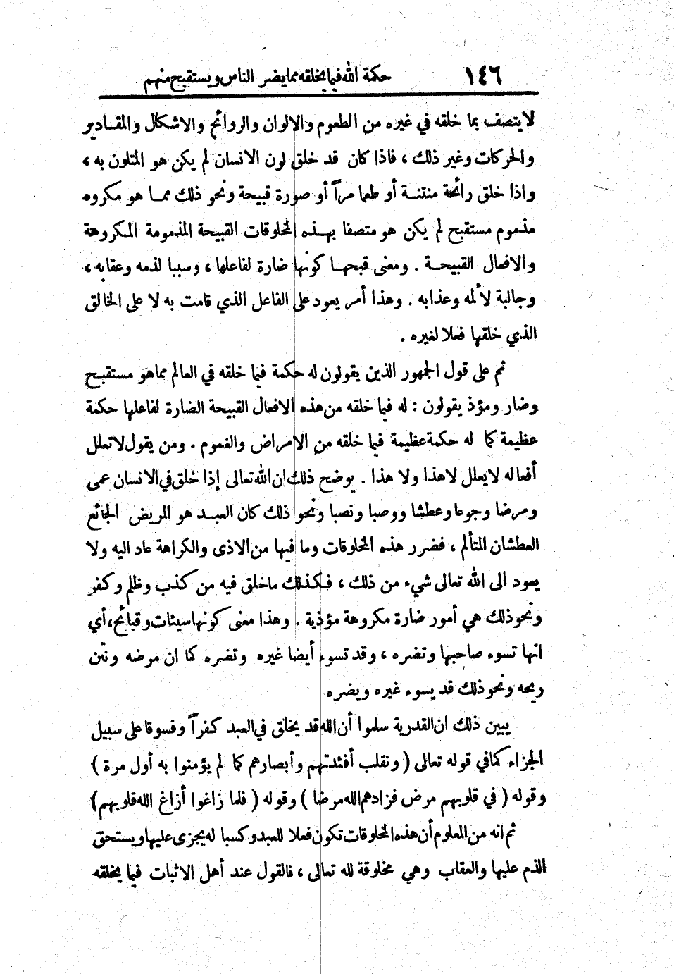 ثم على قول الجمهور الذين يقولون له حكمة فيما خلقه في العالم مما هو مستقبح وضار ومؤذ يقولون: له فيما خلقه من هذه الأفعال القبيحة الضارة لفاعلها حكمة عظيمة كما له حكمة عظيمة فيما خلقه من الأمراض والغموم. ومن يقول لا تعلل أفعاله لا يعلل لا هذا ولا هذا. يوضح ذلك أن الله تعالى إذا خلق في الإنسان عمى ومرضاً وجوعاً وعطشاً ووصباً ونصباً ونحو ذلك كان العبد هو المريض الجائع العطشان المتألم، فضرر هذه المخلوقات وما فيها من الأذى والكراهة عاد إليه ولا يعود إلى الله تعالى شيء من ذلك، فكذلك ما خلق فيه من كذب وظلم وكفر ونحو ذلك هي أمور ضارة مكروهة مؤذية. وهذا معنى كونها سيئات وقبائح، أي أنها تسوء صاحبها وتضره، وقد تسود أيضاً غيره وتضره كما أن مرضه ونتن ريحه ونحو ذلك قد يسوء غيره ويضره.