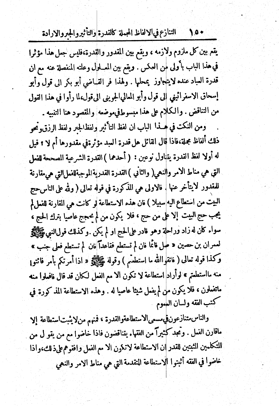 ومن النكت في هذا الباب أن لفظ التأثير ولفظ الجبر ولفظ الرزق ونحو ذلك ألفاظ مجملة، فإذا قال القائل هل قدرة العبد مؤثرة في مقدورها أم لا؟ قيل له أولاً لفظ القدرة يتناول نوعين: (أحدهما) القدرة الشرعية المصححة للفعل التي هي مناط الأمر والنهي (والثاني) القدرة القدرية الموجبة للفعل التي هي مقارنة للمقدور لا يتأخر عنها. فالأولى هي المذكورة في قوله تعالى (ولله على الناس حج البيت من استطاع إليه سبيلا) فإن هذه الاستطاعة لو كانت هي المقارنة للفعل لم يجب حج البيت إلا على من حج، فلا يكون من لم يحجج عاصياً بترك الحج، سواء كان له زاد وراحلة وهو قادر على الحج أو لم يكن. وكذلك قول النبي صلى الله عليه وسلم لعمران بن حصين " صل قائماً فإن لم تستطع فقاعداً فإن لم تستطع فعلى جنب " وكذا قوله تعالى (فاتقوا الله ما استطعتم) وقوله صلى الله عليه وسلم " إذا أمرتكم بأمر فائتوا منه ما استطعتم " لو أراد استطاعة لا تكون إلا مع الفعل لكان قد قال فافعلوا منه ما تفعلون، فلا يكون من لم يفعل شيئاً عاصياً له. وهذه الاستطاعة المذكورة في كتب الفقه ولسان العموم.