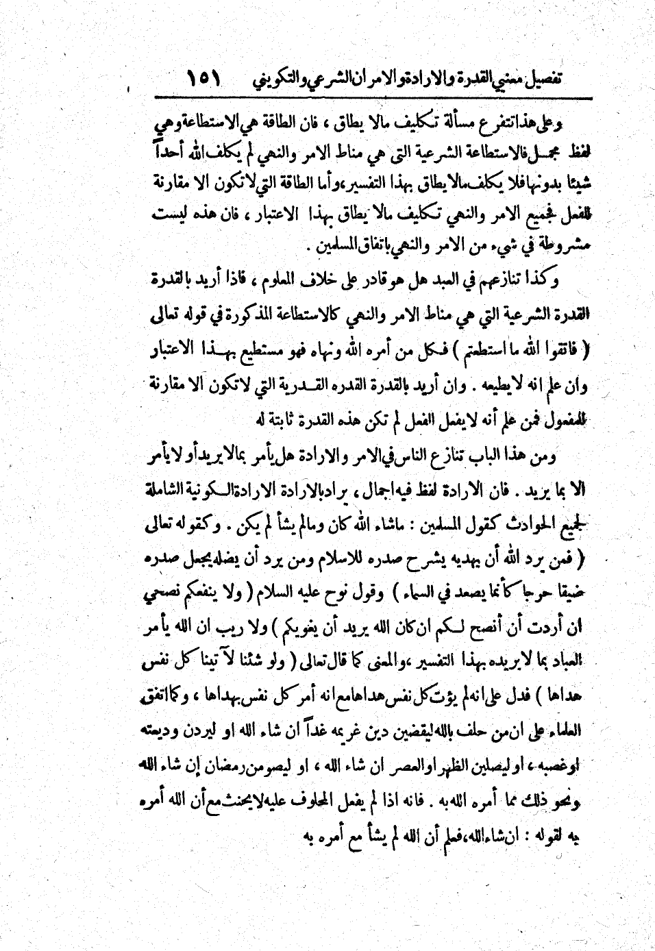 ومن هذا الباب تنازع الناس في الأمر والإرادة هل يأمر بما لا يريد أو لا يأمر إلا بما يريد. فإن الإرادة لفظ فيه إجمال، يراد بالإرادة الإرادة الكونية الشاملة لجميع الحوادث كقول المسلمين: ما شاء الله كان وما لم يشأ لم يكن. وكقوله تعالى (فمن يرد الله أن يهديه يشرح صدره للإسلام ومن يرد أن يضله يجعل صدره ضيقاً حرجاً كأنما يصعد في السماء) وقول نوح عليه السلام (ولا ينفعكم نصحي إن أردت أن أنصح لكم إن كان الله يريد أن يغويكم) ولا ريب أن الله يأمر العبادة بما لا يريده بهذا التفسير، والمعنى كما قال تعالى (ولو شئنا لآتينا كل نفس هداها) فدل على أنه لم يؤت كل نفس هداها مع أنه أمر كل نفس بهداها، وكما اتفق العلماء على أن من حلف بالله ليقضين دين غريمه غداً إن شاء الله أو ليردن وديعته أو غصبه، أو ليصلين الظهر أو العصر إن شاء الله، أو ليصومن رمضان إن شاء الله ونحو ذلك مما أمره الله به. فإنه إذا لم يفعل المحلوق عليه لا يحنث مع أن الله أمره به لقوله: إن شاء الله، فعلم أن الله لم يشأ مع أمره به.