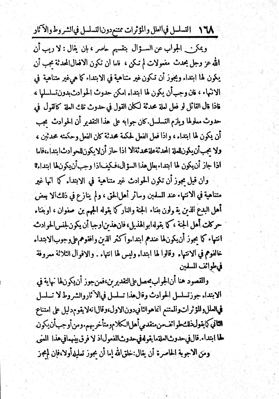 الحديث والفقهاء والصوفية وأهل الكلام: هذه حجة جدلية إلزامية ولم تشفوا الغليل بهذا الجواب، وليس معكم من الأدلة الشرعية ولا العقلية ما ينفى مثل هذا التسلسل، بل التسلسل نوعان والدور نوعان، أحدهما التسلسل في العلل والمعلولات فهذا ممتنع وفاقاً. والثاني التسلسل في الشروط والآثار فهذا في جوازه قولان معروفان للمسلمين وغيرهم. وطوائف من أهل الكلام والحديث والفلسفة يجوزون هذا ومن هؤلاء السلف والأئمة الذين يقولون لم يزل الله متكلماً إذا شاء، وأنه لم يزل يقوم به ما يتعلق بمشيئته وقدرته من الأفعال وغيرها.