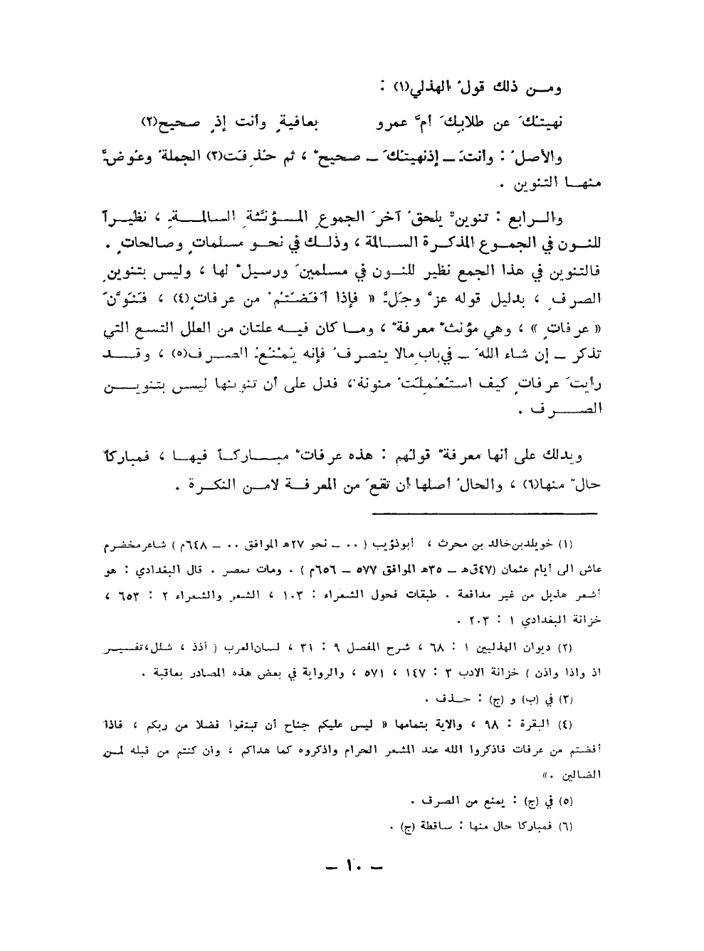 والرابع: تنوين يلحق آخر الجموع المؤنثة السالمة، نظيراً للنون في الجموع المذكورة السالمة، وذلك في نحو مسلمات وصالحات. فالتنوين في هذا الجمع نظير للنون في مسلمين ورسيل لها، وليس بتنوين الصرف، بدليل قوله عز وجل {فإذا أفضتم من عرفات (¬4)، فنون "عرفات"، وهي مؤنث معرفة، وما كان فيه علتان من العلل التسع التي تذكر - إن شاء الله - في باب ما لا ينصرف فإنه يمنع الصرف (¬5)، وقد رأيت عرفات كيف استعملت منونة، فدل على أن تنوينها ليس بتنوين الصرف.