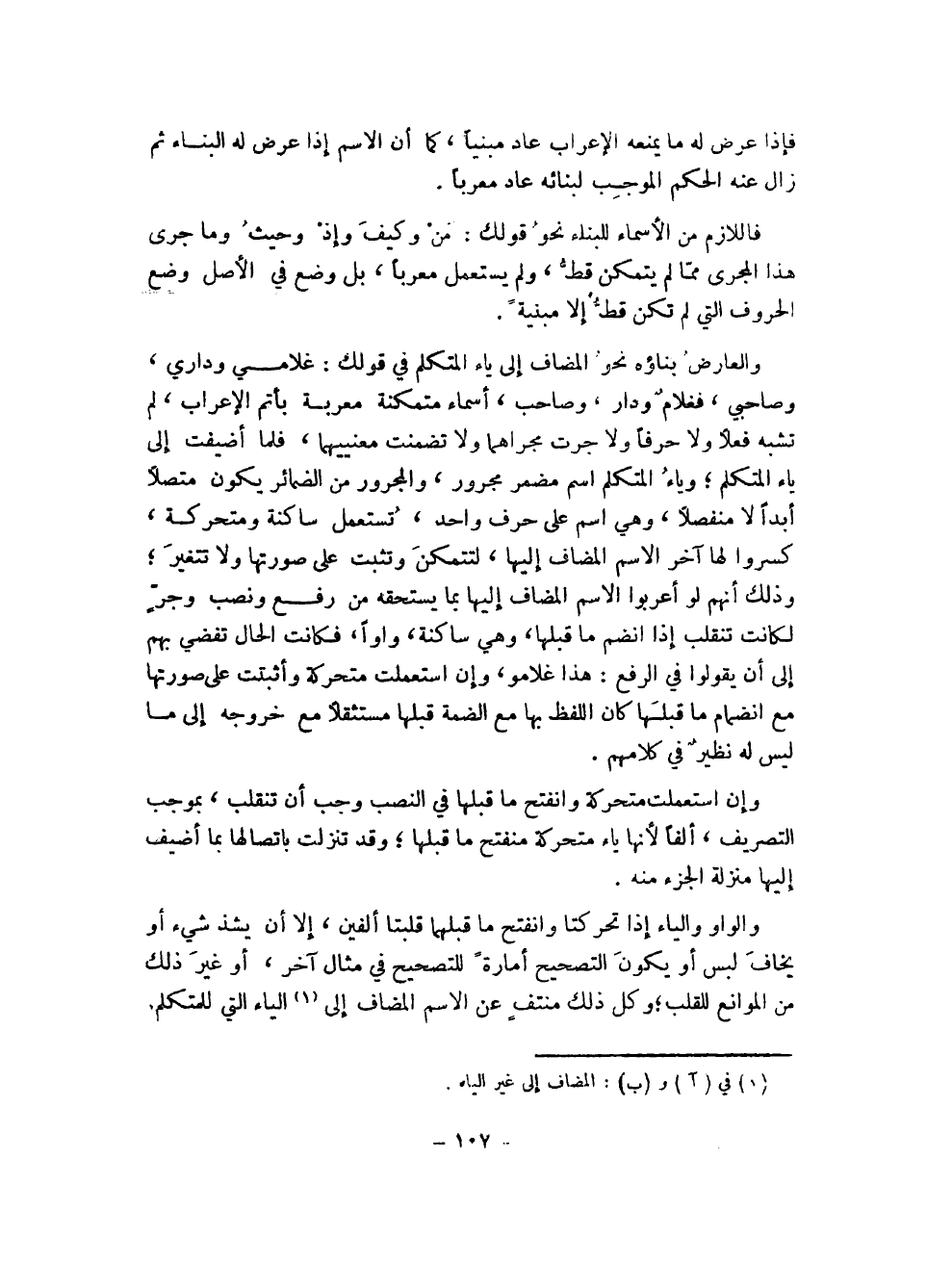 والعارض بناؤه نحو المضاف إلى ياء المتكلم في قولك: غلامي وداري، وصاحبي، فغلام ودار، وصاحب، أسماء متمكنة معربة بأتم الإعراب، لم تشبه فعلاً ولا حرفاً ولا جرت مجراهما ولا تضمنت معنييهما، فلما أضيفت إلى ياء المتكلم؛ وياء المتكلم اسم مضمر مجرور، والمجرور من الضمائر يكون متصلاً أبداً لا منفصلاً، وهي اسم على حرف واحد، تستعمل ساكنة ومتحركة، كسروا لها آخر الاسم المضاف إليها، لتتمكن وتثبت على صورتها ولا تتغير؛ وذلك أنهم لو أعربوا الاسم المضاف إليها بما يستحقه من رفع ونصب وجر لكانت تنقلب إذا انضم ما قبلها، وهي ساكنة، واواً، فكانت الحال تفضي بهم إلى أن يقولوا في الرفع: هذا غلامو، وإن استعملت متحركة وأثبتت على صورتها مع انضمام ما قبلها كان اللفظ بها مع الضمة قبلها مستثقلاً مع خروجه إلى ما ليس له نظير في كلامهم.