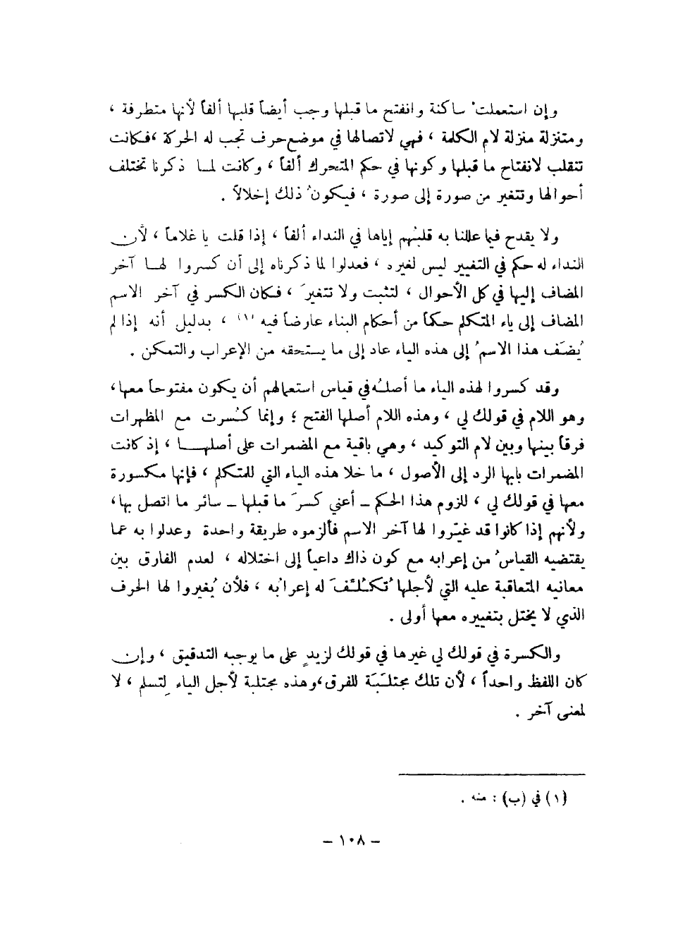 وقد كسروا لهذه الياء ما أصله في قياس استعمالهم أن يكون مفتوحاً معها، وهو اللام في قولك لي، وهذه اللام أصلها الفتح؛ وإنما كسرت مع المظهرات فرقاً بينهما وبين لام التوكيد، وهي باقية مع المضمرات على أصلها، إذ كانت المضمرات بابها الرد إلى الأصول، ما خلا هذه الياء التي للمتكلم، فإنها مكسورة معها في قولك لي، للزوم هذا الحكم -أعني كسر ما قبلها- سائر ما تصل بها، ولأنهم إذا كانوا قد غيروا لها آخر الاسم فألزموه طريقة واحدة وعدلوا به عما يقتضيه القياس من إعرابه مع كون ذاك داعياً إلى اختلاله، لعدم الفارق بين معانيه المتعاقبة عليه التي لأجلها تكلف له إعرابه، فلأن يغيروا لها الحرف الذي لا يختل بتغييره معها أولى.