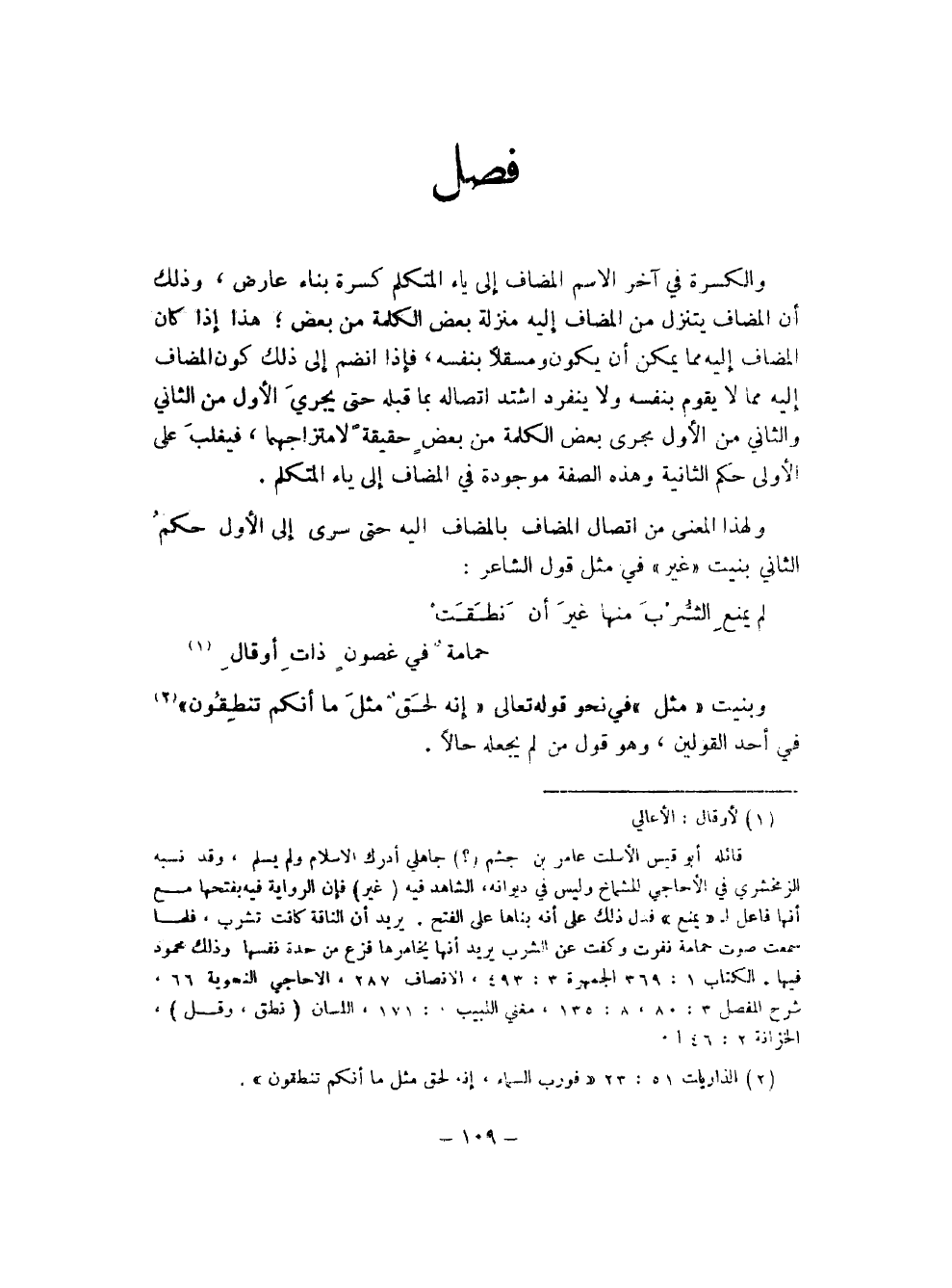 والكسرة في آخر الاسم المضاف إلى ياء المتكلم كسرة بناء عارض، وذلك أن المضاف يتنزل من المضاف إليه منزلة بعض الكلمة من بعض؛ هذا إذا كان المضاف إليه مما يمكن أن يكون ومستقلاً بنفسه، فإذا انضم إلى ذلك كون المضاف إليه مما لا يقوم بنفسه ولا ينفرد اشتد اتصاله بما قبله حتى يجري الأول من الثاني والثاني من الأول مجرى بعض الكلمة من بعض حقيقة لامتزاجهما، فيغلب على الأولى حكم الثانية وهذه الصفة موجودة في المضاف إلى ياء المتكلم.