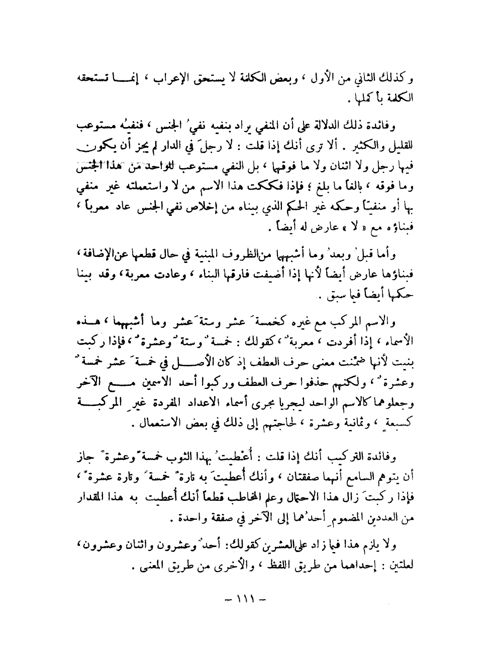 وفائدة ذلك الدلالة على أن المنفي يراد ينفيه نفي الجنس، فنفيه مستوعب للقليل والكثير. ألا ترى أنك إذا قلت: لا رجل في الدار لم يجز أن يكون فيها رجل ولا اثنان ولا ما فوقهما، بل النفي مستوعب للواحد من هذا الجنس وما فوقه، بالغاً ما بلغ؛ فإذا فككت هذا الاسم من لا واستعملته غير منفي بها أو منفياً وحكمة غير الحكم الذي بيناه من إخلاص نفي الجنس عاد معرباً، فبناؤه مع «لا» عارض له أيضاً.