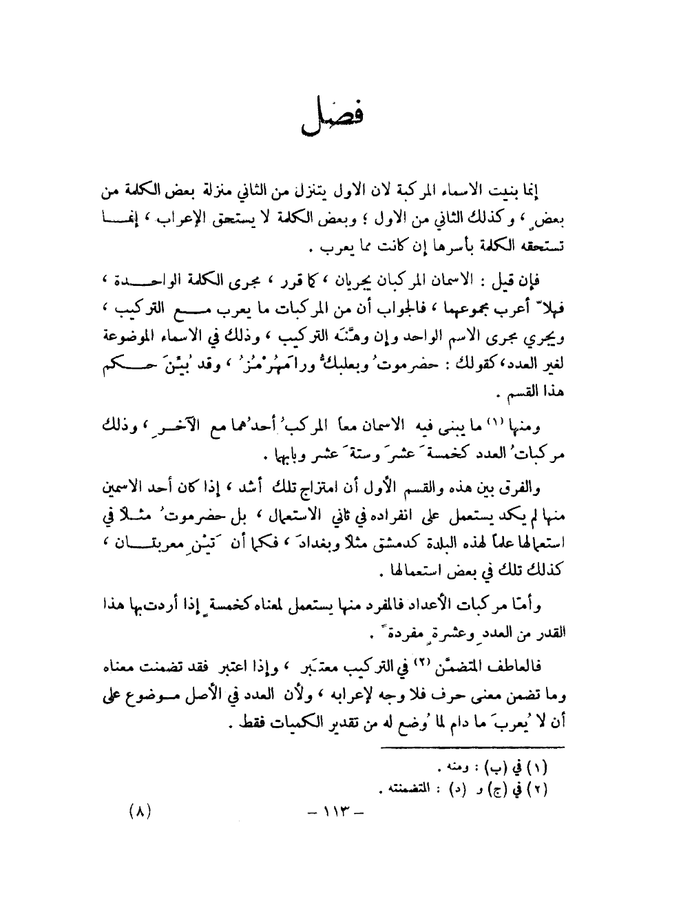وأما مركبات الأعداد فالمفرد منها يستعمل لمعناه كخمسة إذا أردت بها هذا القدر من العدد وعشرة مفردةً.