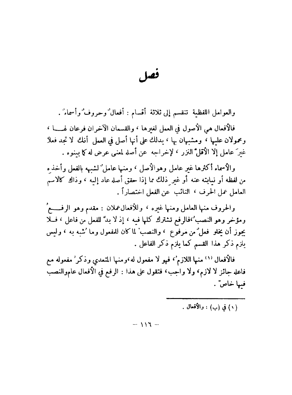 والحروف منها العامل ومنها غيره، وللأفعال عملان: مقدم وهو الرفع ومؤخر وهو النصب، فالرفع تشترك كلها فيه، إذ لابد للفعل من فاعل، فلا يجوز أن يخلو فعل من مرفوع، والنصب لما كان للمفعول وما شبه به، وليس يلزم ذكر هذا القسم كما يلزم ذكر الفاعل.