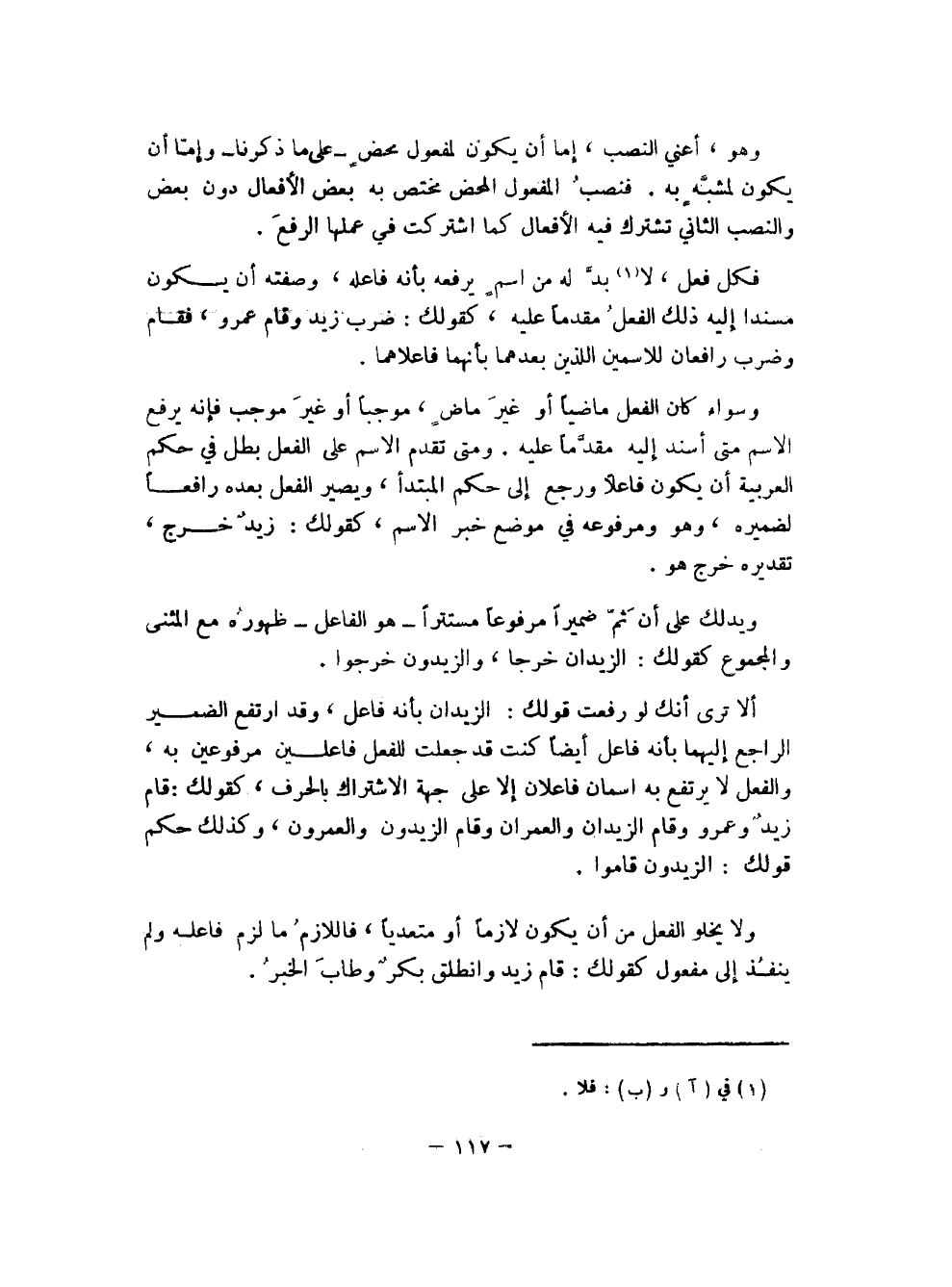 وهو، أعني النصب، إما أن يكون لمفعول محض -على ما ذكرنا- وإما أن يكون لمشبه به. فنصب المفعول المحض مختص به بعض الأفعال دون بعض والنصب الثاني تشترك فيه الأفعال كما اشتركت في عملها الرفع.