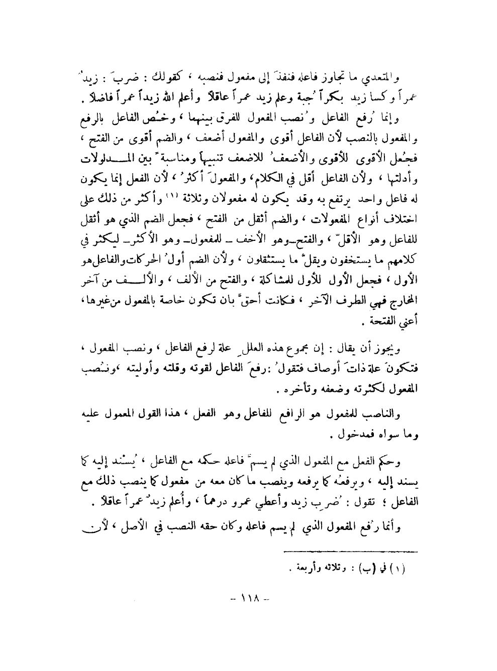 وإنما رفع الفاعل ونصب المفعول للفرق بينهما، وخص الفاعل بالرفع والمفعول بالنصب لأن الفاعل أقوى والمفعول أضعف، والضم أقوى من الفتح، فجعل الأقوى للأقوى والأضعف للأضعف تنبيهاً ومناسبة بين المدلولات وأدلتها، ولأن الفاعل أقل في الكلام، والمفعول أكثر، لأن الفعل إنما يكون له فاعل واحد يرتفع به وقد يكون له مفعولان وثلاثة (¬1) وأكثر من ذلك على اختلاف أنواع المفعولات، والضم أثقل من الفتح، فجعل الضم الذي هو أثقل للفاعل وهو الأقل، والفتح -وهو الأخف -للمفعول -وهو الأكثر-ليكثر في كلامهم ما يستخفون ويقل ما يستثقلون، ولأن الضم أول الحركات والفاعل هو الأول، فجعل الأول للأول للمشاكلة، والفتح من الألف، والألف من آخر المخارج فهي الطرف الآخر، فكانت أحق بأن تكون خاصة بالمفعول من غيرها، أعني الفتحة.