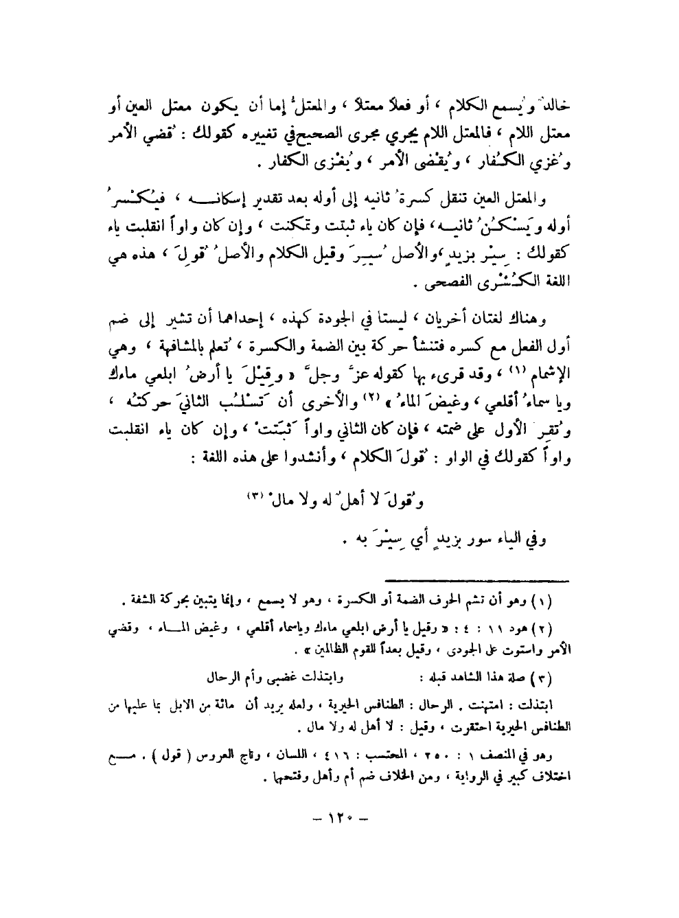 وهو في المنصف 1: 250، المحتسب: 416، اللسان، وتاج العروس (قول). مع اختلاف كبير في الرواية، ومن الخلاف ضم أم وأهل وفتحهما.