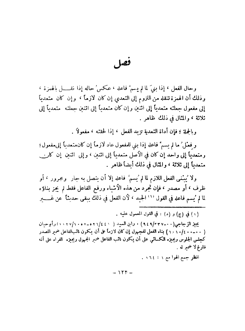 وحال الفعل، إذا بني لما لم يسم فاعله، عكس حاله إذا نقل بالهمزة، وذلك أن الهمزة تنقله من اللزوم إلى التعدي إن كان لازماً، وإن كان متعدياً إلى مفعول جعلته متعدياً إلى اثنين وإن كان متعدياً إلى اثنين جعلته متعدياً إلى ثلاثة، والمثال في ذلك ظاهر.