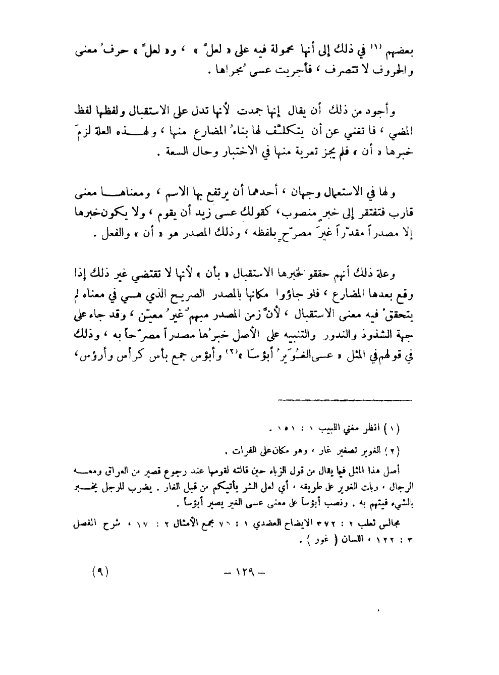 وعلة ذلك أنهم حققوا الخبرها الاستقبال «بأن» لأنها لا تقتضي غير ذلك إذا وقع بعدها المضارع، فلو جاؤوا مكانها بالمصدر الصريح الذي هي في معناه لم يتحقق فيه معنى الاستقبال، لأن زمن المصدر مبهم غير معين، وقد جاء على جهة الشذوذ والندور والتنبيه على الأصل خبرها مصدراً مصرحاً به، وذلك في قولهم في المثل «عسى الغُوَير أبؤسا» (¬2) وأبؤس جمع بأس كرأس وأرؤس،