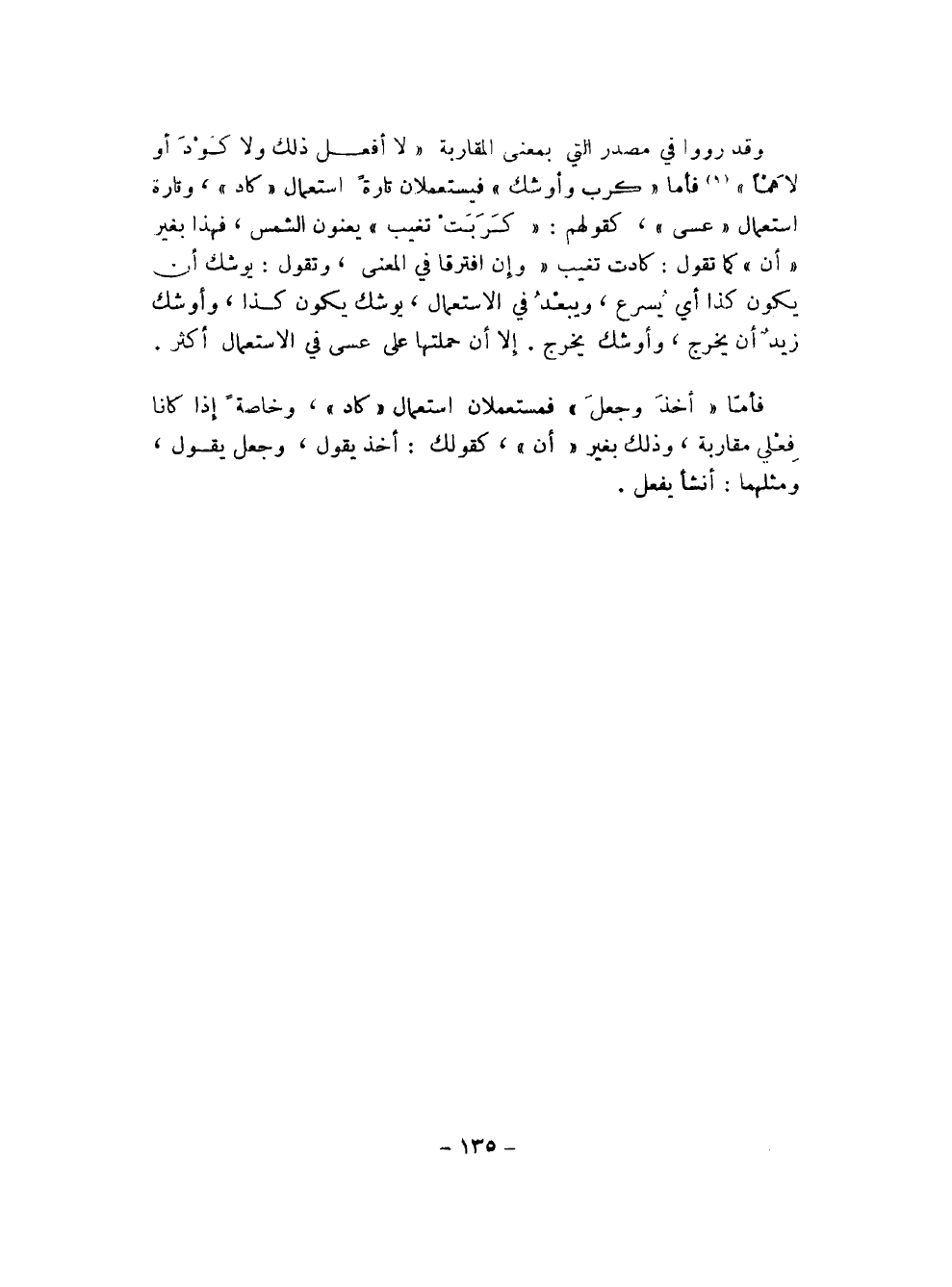 فأما "أخذ وجعل" فمستعملان استعمال "كاد"، وخاصةً إذا كانا فعلى مقاربة، وذلك بغير "أن"، كقولك: أخذ يقول، وجعل يقول، ومثلما: أنشأ يفعل.