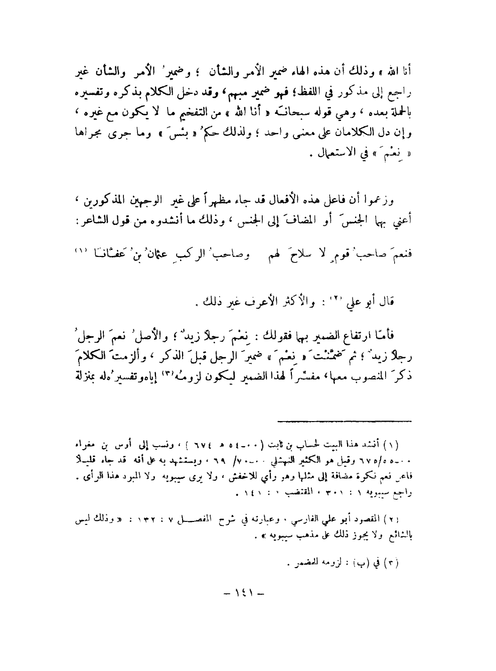 فأما ارتفاع الضمير بهما فقولك: نعم رجلاً زيد؛ والأصل نعم الرجل رجلاً زيد؛ ثم ضمنت "نعم" ضمير الرجل قبل الذكر، وألزمت الكلام ذكر المنصوب معها، مفسرًا لهذا الضمير ليكون لزومه (¬3) إياه وتفسيره له بمنزلة