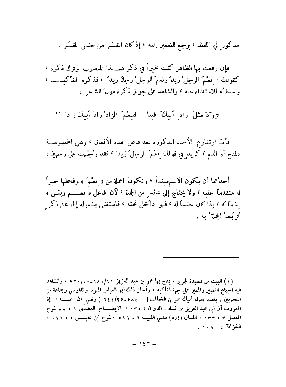 فإن رفعت بها الظاهر كنت مخيرًا في ذكر هذا المنصوب وترك ذكره، كقولك: نعم الرجل زيد ونعم الرجل رجلاً زيد، فذكره للتأكيد، وحذفه للاستغناء عنه، والشاهد على جواز ذكره قول الشاعر: