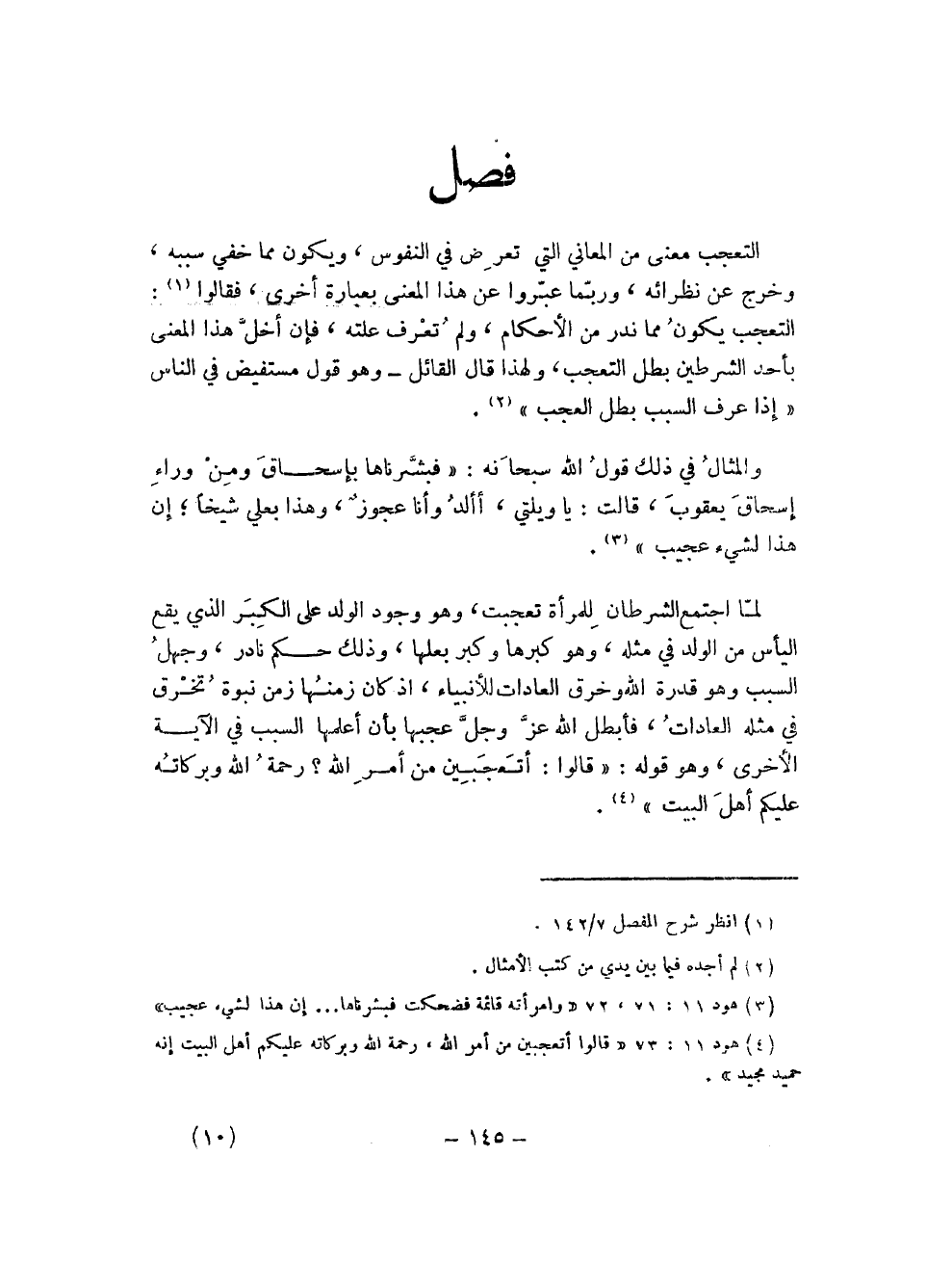 لما اجتمع الشرطان للمرأة تعجبت، وهو وجود الولد على الكبر الذي يقع اليأس من الولد في مثله، وهو كبرها وكبر بعلها، وذلك حكم نادر، وجهل السبب وهو قدرة الله وخرق العادات للأنبياء، إذ كان زمن تبوة تخرق في مثله العادات، فأبطل الله عز وجل عجبها بأن أعلمها السبب في الآية الأخرى، وهو قوله: {قَالُوا أَتَعْجَبِينَ مِنْ أَمْرِ اللهِ رَحْمَتُ اللهِ وَبَرَكَاتُهُ عَلَيْكُمْ أَهْلَ الْبَيْتِ} [هود: 73] (¬4).