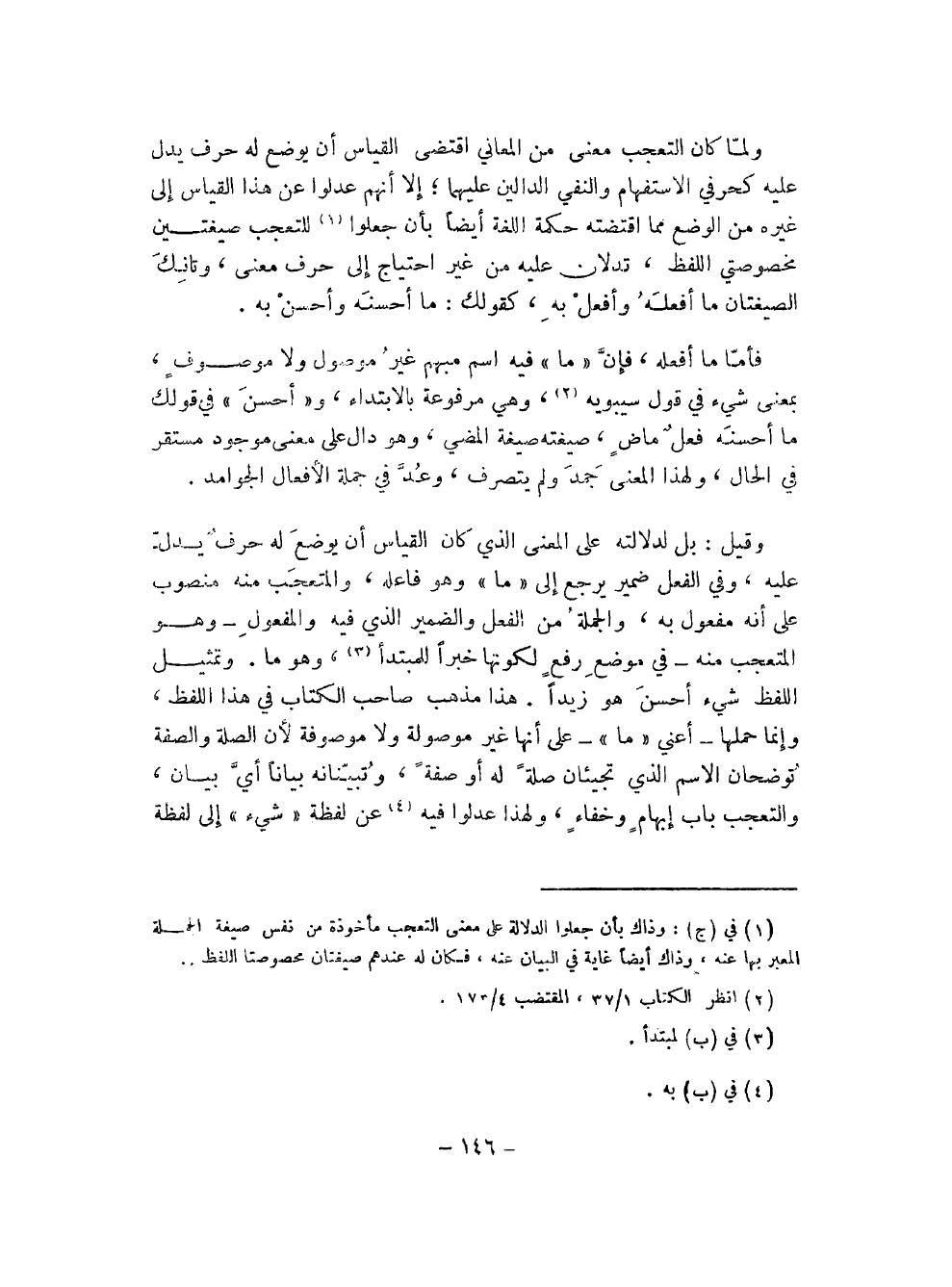 (¬1) ((في (ج): وذاك بأن جعلوا الدلالة على معنى التعجب مأخوذة من نفس صيغة الجملة المعبر بها عنه، وذاك أيضًا غاية في البيان عنه، فكان له عندهم صيغتان محصوصتا اللفظ ..