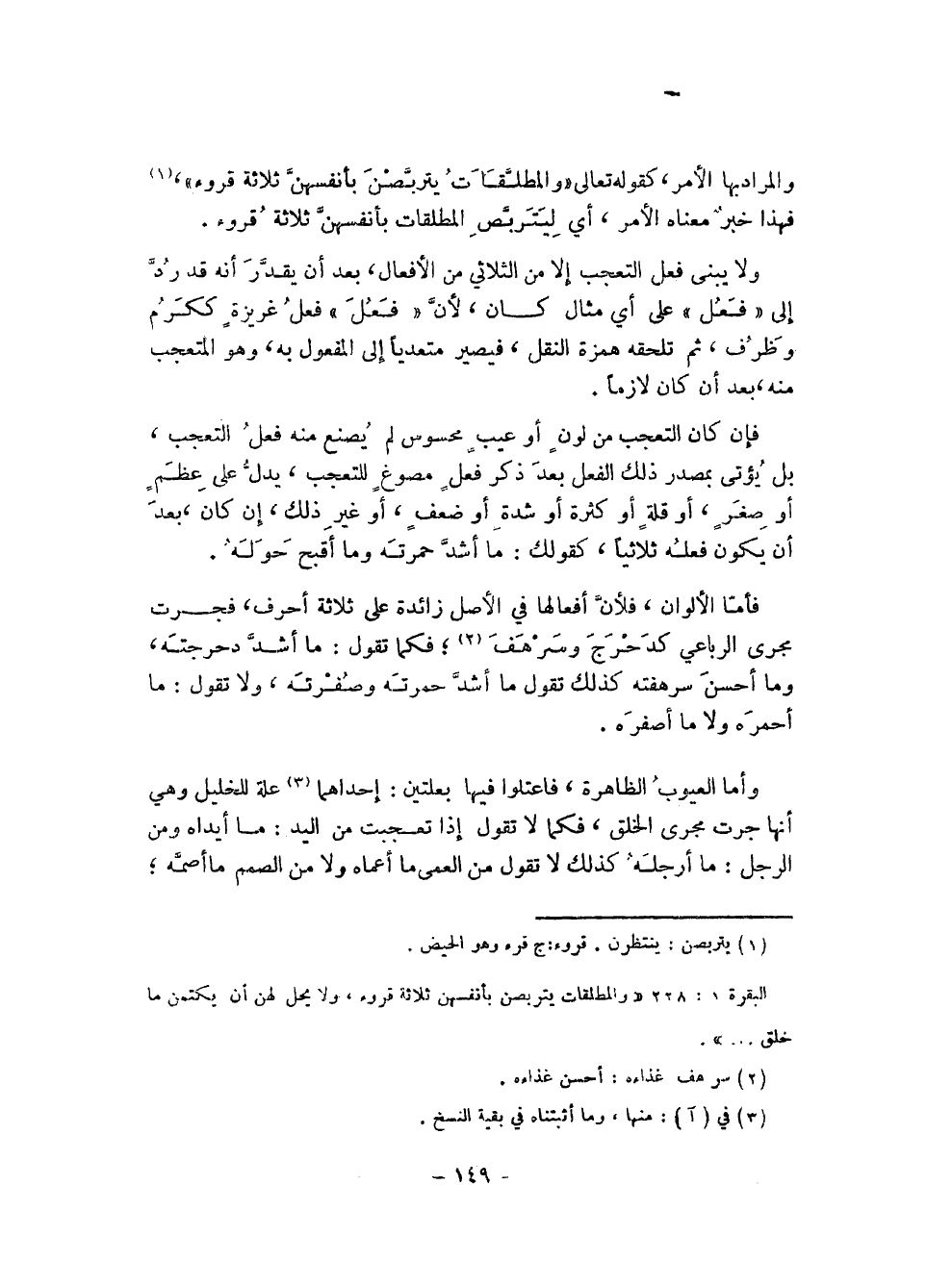 وأما العيوب الظاهرة، فاعتلوا فيها بعلتين: إحداهما (¬3) علة للخليل وهي أنها جرت مجرى الخلق، فكما لا تقول إذا تعجبت من اليد: ما أيداه ومن الرجل: ما أرجله كذلك لا تقول من العمى ما أعماه ولا من الصمم ما أصمه؛