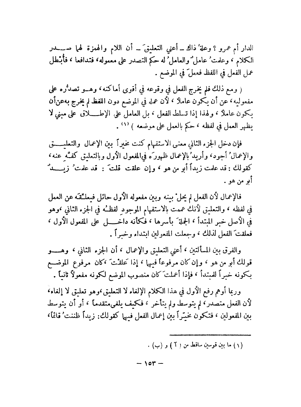 الدار أم عمرو؟ وعلة ذاك-أعني التعليق-أن اللام والهمزة لهما صدر الكلام، وعلمت عامل والعامل له حكم التصدر على معموله، فتدافعا، فأُبطل عمل الفعل في اللفظ فعمل في الموضع.